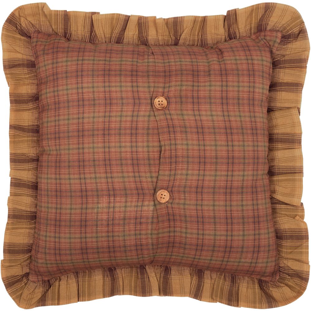 Neutral tones don't have to be boring. The Prescott Pillow measures 16x16 inches and its muted, earthy tones of dark brown and tan with a wide ruffled edging prove that you can balance casual and elegant with the same design. The traditional plaid reverses to a tighter striping on the reverse with added stripes of russet and earthy green for a wild meadow feel. Button-style closures are included for easy cleaning. Coordinate this rustic accent pillow with the Prescott Collection by VHC to blanket your entire home in rustic cottage style.