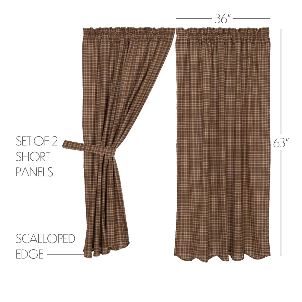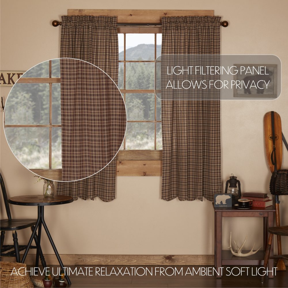 Decorate your windows with a touch of relaxed, rustic country style with this charmingly designed and thoughtfully crafted window panel set. Displaying a timeless country look with a dark, cabin-inspired traditional plaid in deep brown, creme and khaki tan with scalloped edging, the Prescott Short Panel Set 63x36 enhances your home decor with a relaxed, cozy lodge feel. This 100% cotton curtain set includes two panels with a white lining to prevent fading and provide additional privacy. It includes a rod pocket for easy hanging.