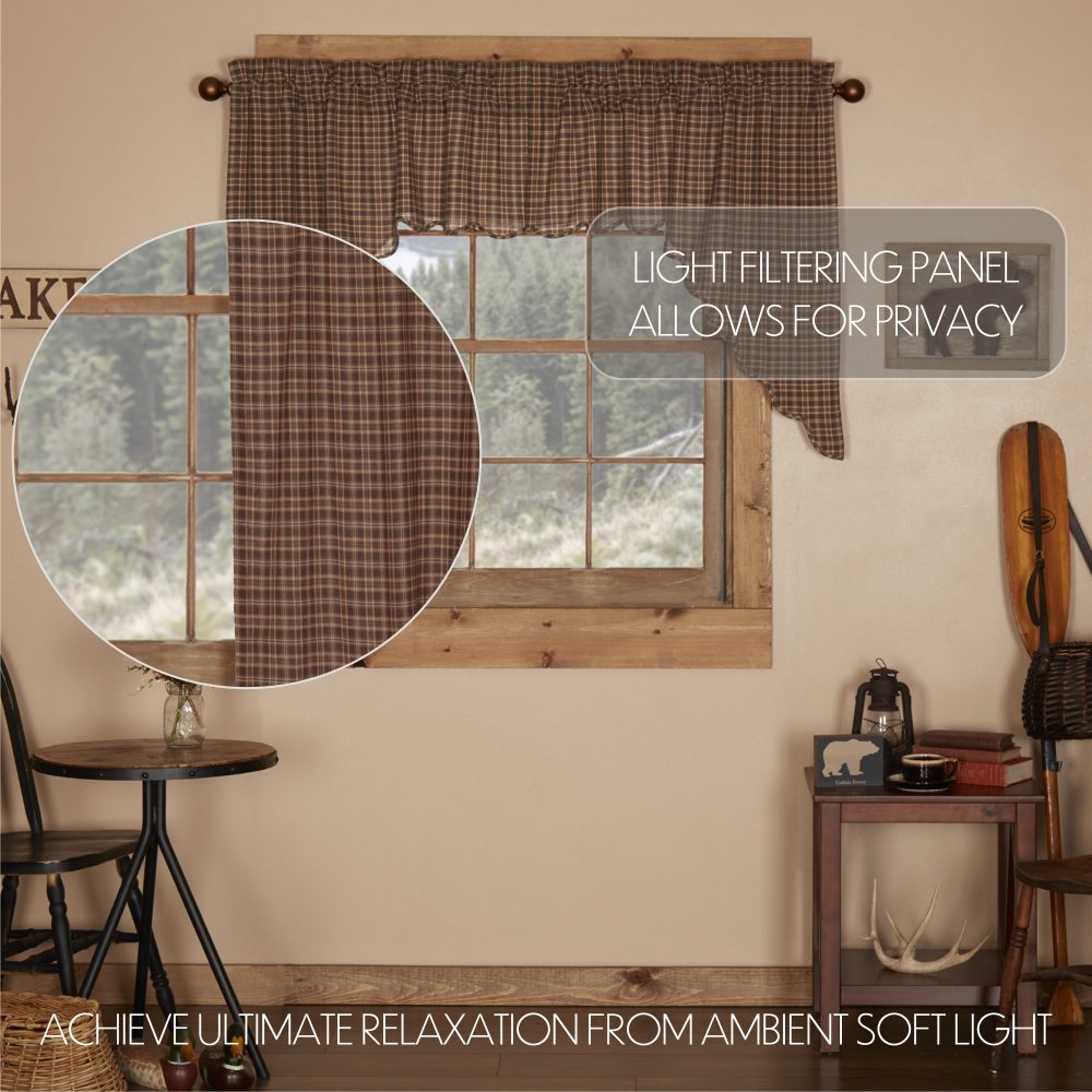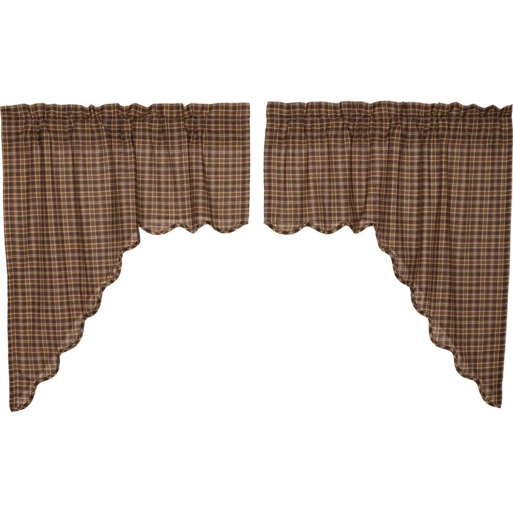 Decorate your windows with a touch of relaxed, rustic country style with this charmingly designed and thoughtfully crafted window swag set. Displaying a timeless country look with a dark, cabin-inspired traditional plaid in deep brown, creme and khaki tan with scalloped edging, the Prescott Scalloped Swag Set 36x36x16 enhances your home decor with a modern country feel. This 100% cotton curtain set includes two short swag-style panels with a white lining to prevent fading and provide additional privacy. It includes a rod pocket for easy hanging.