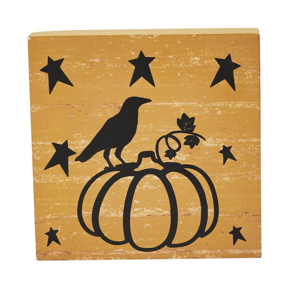 • ELEVATE FALL DECOR & ENDURE: Introduce rustic charm with this VHC Brands Prim Stars Primitive Halloween Pumpkin Raven MDF Sign, a robust 5×5 inch square piece meticulously crafted from durable MDF, showcasing a striking raven perched on a plump pumpkin amidst primitive stars on a beautifully distressed mustard yellow base, embodying timeless Farmhouse and Cottage Core aesthetics, and featuring a wipe-clean surface for effortless maintenance and lasting enjoyment as a versatile tabletop accent.