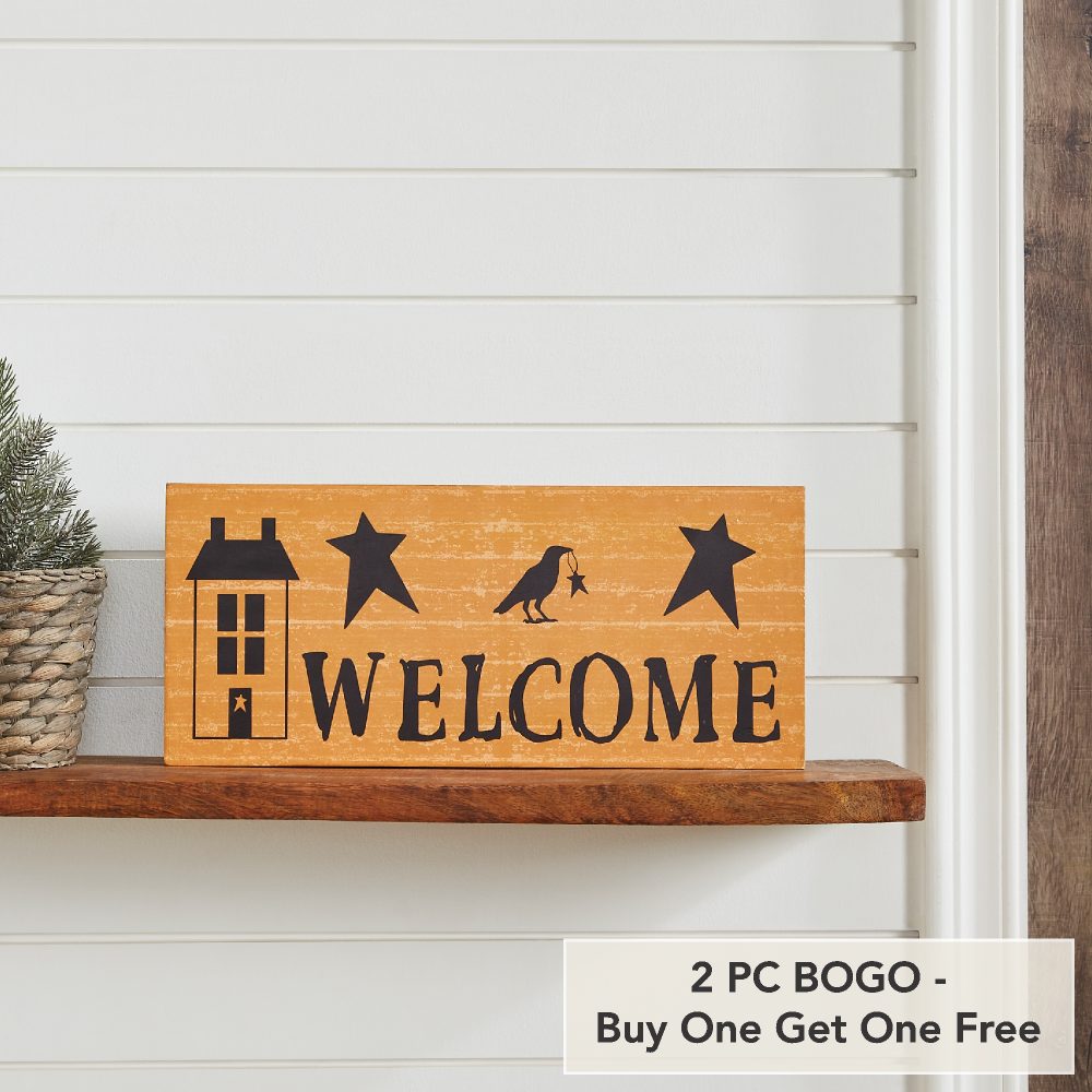 - Sku – 85418 – Primitive Rustic Welcome Wall Decor Sign Mustard Saltbox House, Raven & Stars MDF Accent 7×16 Inch (2 Packages)