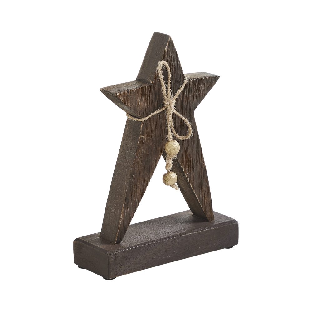 Add a rustic touch of holiday charm to your seasonal decor with the VHC Brands Primitive Wonder Dark Wooden Star. This 6x8 decorative figurine features a classic five-pointed star crafted from tropical wood and painted in a deep brown hue with subtle light tan distressing. The vintage-inspired design is securely affixed to a wood base, making it a sturdy and stylish accent for any tabletop or shelf. A twine bow tied at the base, complete with small wood beads, adds a handcrafted, primitive feel that enhances the overall rustic aesthetic. The solid color palette and distressed finish make it a versatile addition to traditional, farmhouse, or woodland Christmas themes. Whether used on its own or as part of a larger arrangement, this star brings warmth and a quiet elegance to your winter display. Perfect for use in the bathroom, bedroom, dining room, entryway, kitchen, or living room, the Primitive Wonder Dark Wooden Star offers timeless appeal throughout the holiday season. Built to last and easy to maintain, simply wipe clean with a soft cloth to keep it looking its best year after year. It's a simple yet meaningful addition to your Christmas decor collection.