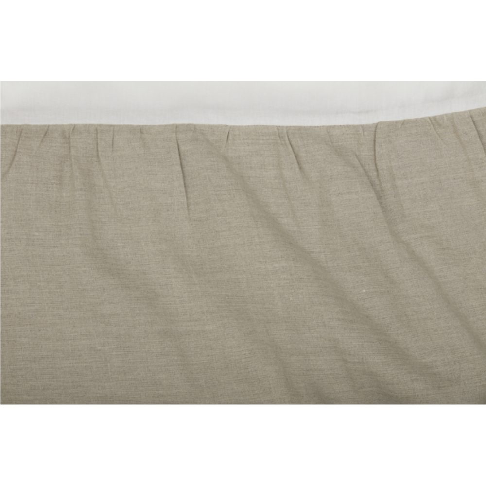 - Skirt is 100% undyed linen in Taupe. Deck is 100% cotton. The durable fine flax fibers have absorbent and cooling properties, making it a brilliant choice for any bedding ensemble.