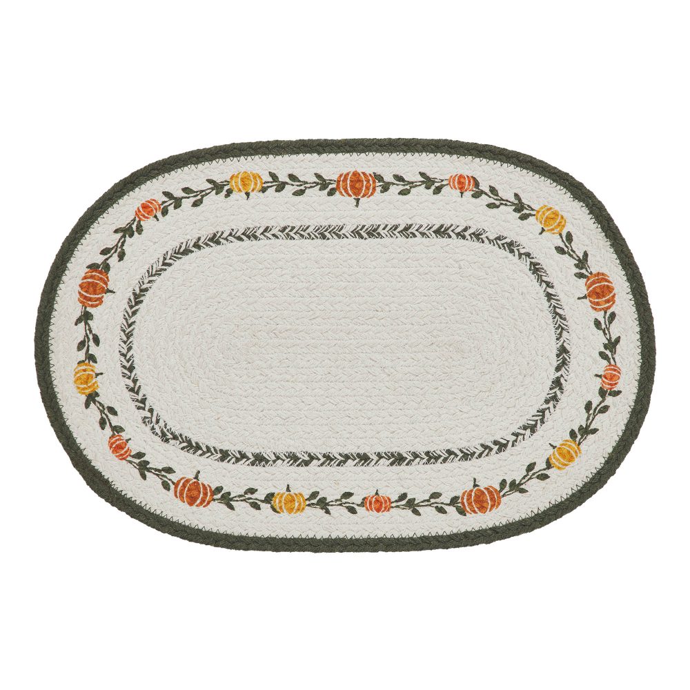 Imagine stepping into a cozy autumn embrace with the VHC Brands Braided Cotton Pumpkin Bounty Oval Placemat Stencil. Crafted from a delightful blend of cotton and polyester, its gentle softness offers an inviting touch to your fall table, promising a truly comforting dining experience. The charming oval shape, meticulously braided, forms a rustic yet elegant canvas, while the intricate stencil work brings harvest magic to life. See the vibrant glow of plump pumpkins and the delicate curl of winding vines, painted in rich hues of burnt orange and cypress green, gracing your setting with an undeniable warmth and festive cheer. This decorative placemat is designed to perfectly capture the serene essence of fall, transforming your home into a welcoming farmhouse retreat. The graphic display of bountiful pumpkins and lush vines whispers tales of harvest abundance, making it an indispensable accent for your fall feasts and cherished Thanksgiving gatherings. Whether nestled on your dining room table or adorning a rustic kitchen island, its country charm creates an atmosphere brimming with warmth, ready for cherished family moments. Beyond its inviting aesthetic, this VHC Brands placemat offers practical beauty; hand washable for easy care, its stenciled design ensures lasting vibrancy, allowing you to celebrate the season's bounty year after year.