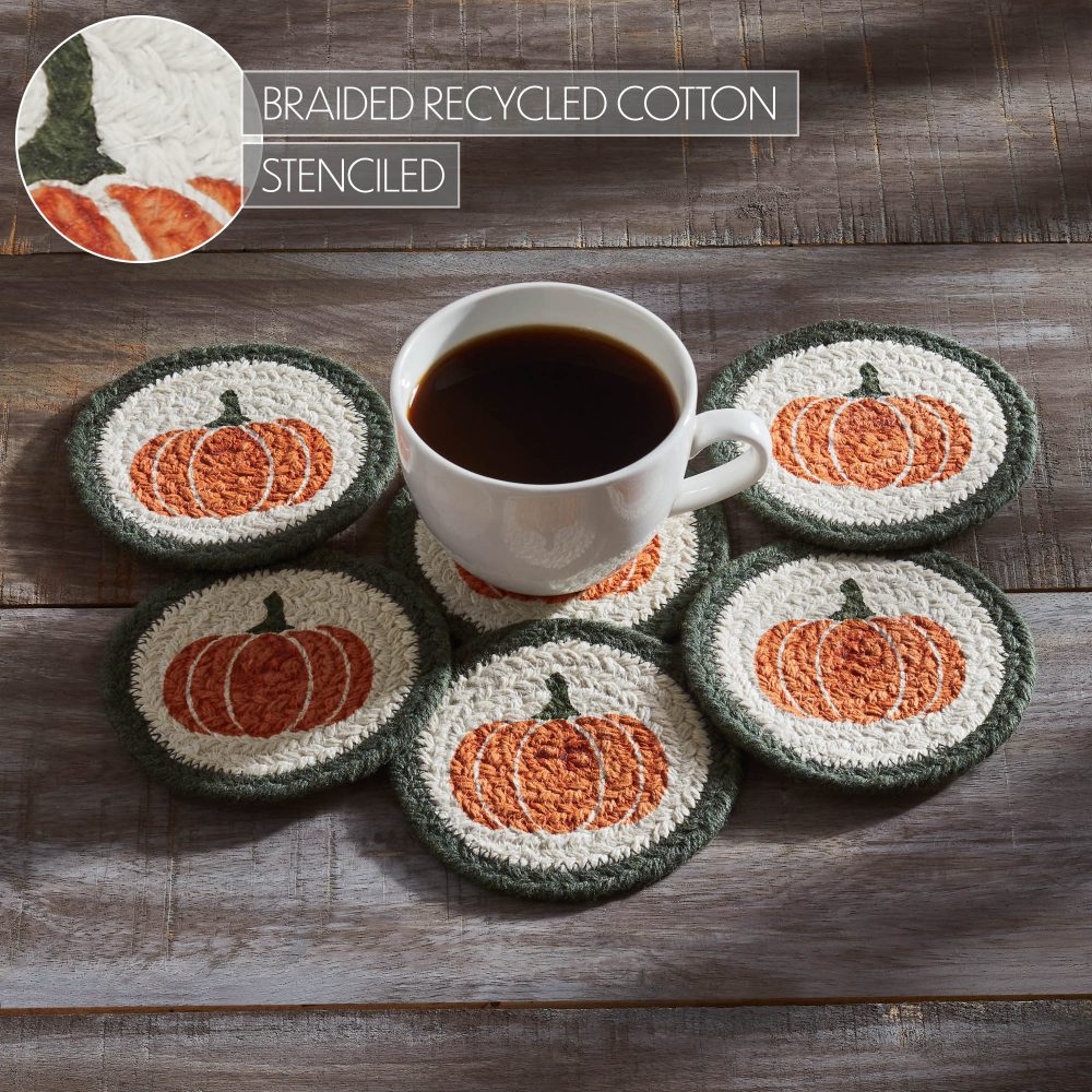 - ELEVATE YOUR FALL DECOR & PROTECT TABLES: Safeguard your surfaces and celebrate autumn with this meticulously crafted set of 6 round, braided coasters, made from a durable cotton-polyester blend and artfully stenciled with harvest pumpkins in creamy ivory, fiery burnt orange, and verdant cypress green; their generous size ensures stable placement for drinks, preventing water rings and spills, while effortlessly infusing your home with rustic elegance and farmhouse charm for Thanksgiving, Halloween, and all your seasonal gatherings, easily maintained with a simple hand wash.