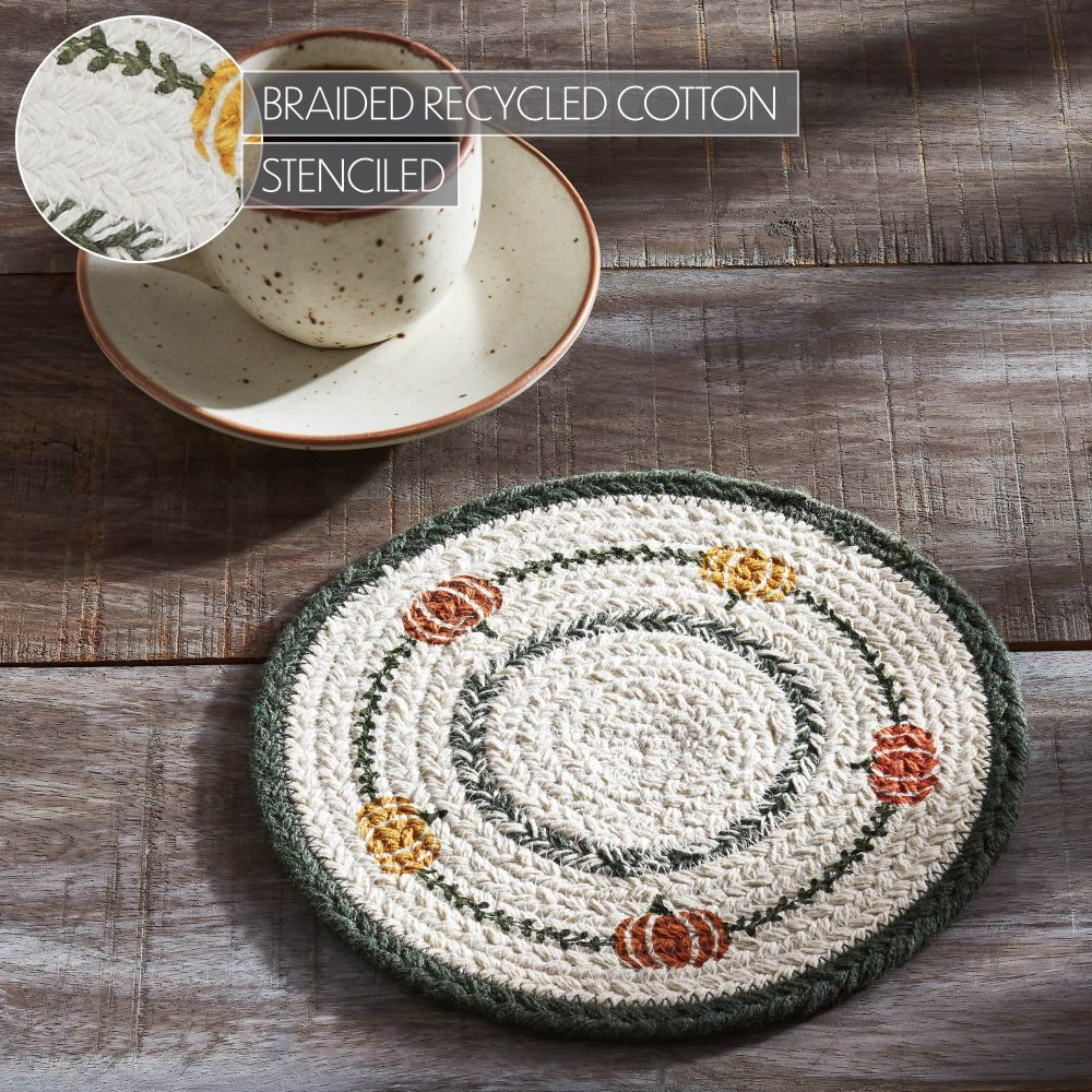 - PROTECT YOUR SURFACES: Hand-stenciled with warm fall tones and braided from heat-resistant premium cotton-polyester, this 8-inch round trivet beautifully shields tables while infusing farmhouse charm into your seasonal kitchen decor.
