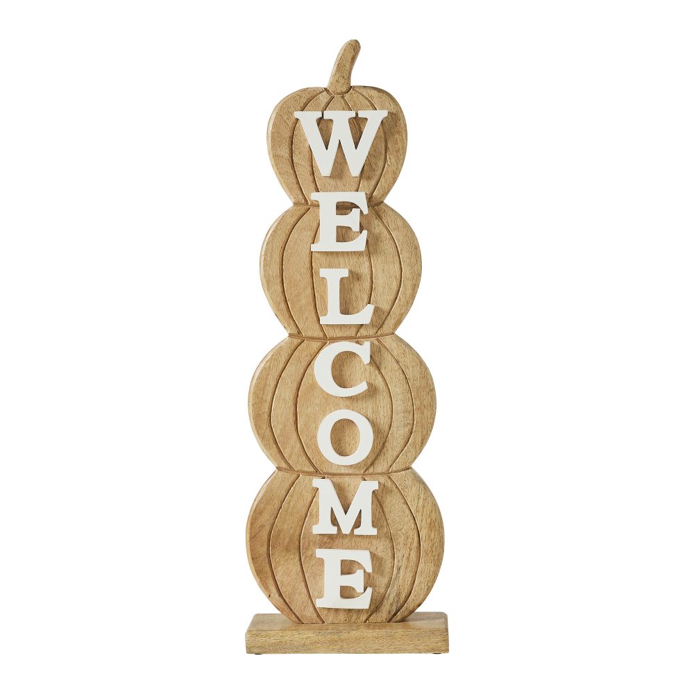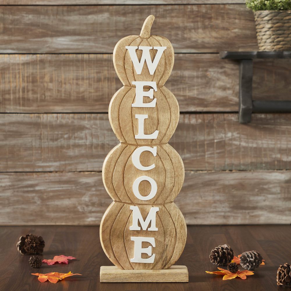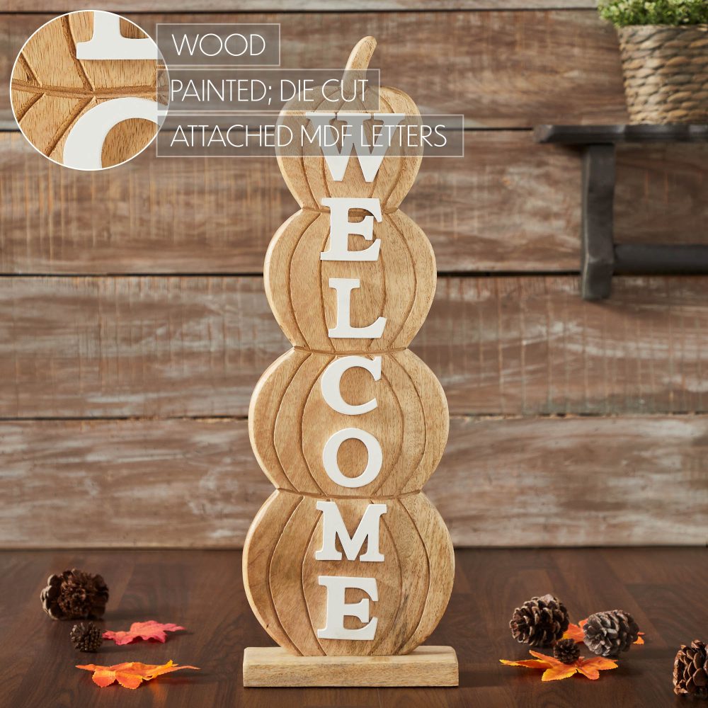 - PREMIUM CONSTRUCTION & DIMENSIONS: Crafted from substantial tropical wood, this VHC Brands sign measures an impressive 24.5 inches wide, 8.25 inches high, and 3 inches deep, showcasing a rustic stack of painted pumpkins in warm wood brown and light creme hues, topped by meticulously rendered tactile wood cutouts forming the “Welcome” message, designed to create an elegant and inviting focal point for your autumn and harvest decor.