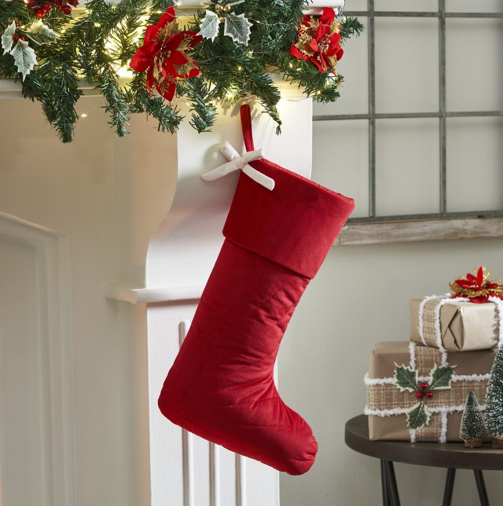 Add a vibrant and festive touch to your holiday decor with the VHC Brands Quilted Velvet Stocking with Bow. Measuring 11x18 inches, this elegant stocking features a rich bright red velvet body with a soft quilted texture that brings warmth and luxury to your seasonal display. The crisp white bow tied around the cuff provides a striking contrast, enhancing its classic Christmas appeal. Crafted from durable polyester, this stocking is designed to hold holiday treats and small gifts while adding charm to your mantel, staircase, or holiday vignette. Its solid color design and plush velvet fabric make it a versatile piece that fits seamlessly into traditional, farmhouse, or modern Christmas themes. The simple yet sophisticated look brings a polished finish to your festive celebrations. Perfect for use in any room-bathroom, bedroom, dining room, entryway, kitchen, or living room-the Quilted Velvet Stocking with Bow adds cheerful color and cozy texture to your home. Spot clean only to keep it looking fresh and vibrant year after year. This stocking is a beautiful and functional holiday accent that will be a treasured part of your Christmas traditions.
