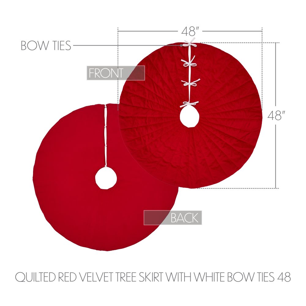 Bring vibrant holiday warmth to your decor with the VHC Brands Quilted Velvet Christmas Tree Skirt with Bow Ties in bright red. Measuring 48x48 inches, this plush tree skirt features a solid red velvet fabric with elegant channel quilting that adds texture and richness to your festive setup. Bright white bow ties secure the opening, offering a striking contrast and a classic seasonal touch. Crafted from durable polyester, this round tree skirt combines style with practicality, protecting your floors while beautifully framing your Christmas tree. The solid color velvet fabric lends a cozy, luxurious feel that perfectly complements primitive rustic, farmhouse, and traditional holiday themes. Its simple yet festive design makes it a versatile and elegant addition to any holiday space. Ideal for display in any room-bathroom, bedroom, dining room, entryway, kitchen, or living room-this Quilted Velvet Christmas Tree Skirt with Bow Ties adds cheerful color and refined charm to your home. Spot clean only to maintain its vibrant look and softness year after year. This stunning tree skirt is a festive essential that completes your holiday decor with warmth and grace.