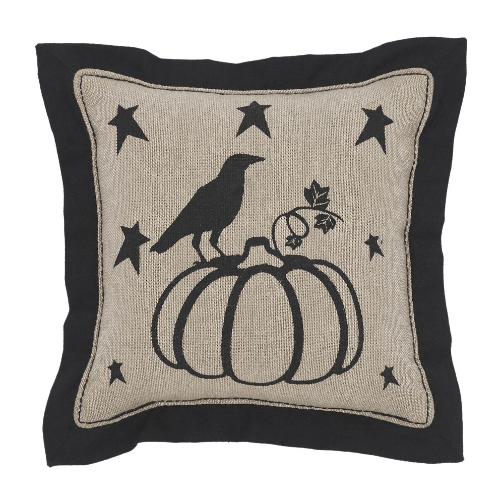 • EXQUISITE DESIGN & QUALITY: This VHC Brands 6×6-inch square decorative accent pillow features a charming printed motif of a vigilant black raven atop a plump pumpkin amidst primitive stars, rendered in harmonious natural off-white and deep country black hues, meticulously crafted from soft, breathable cotton for a comfortable, touchable texture and designed for lasting beauty with convenient spot clean only care.