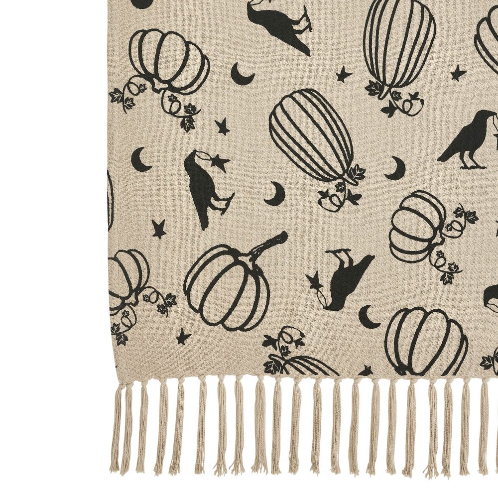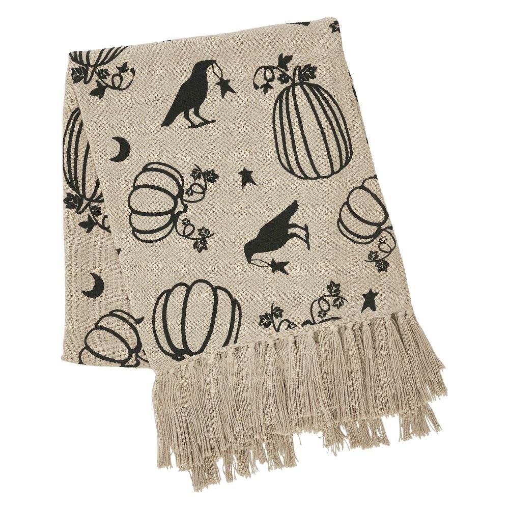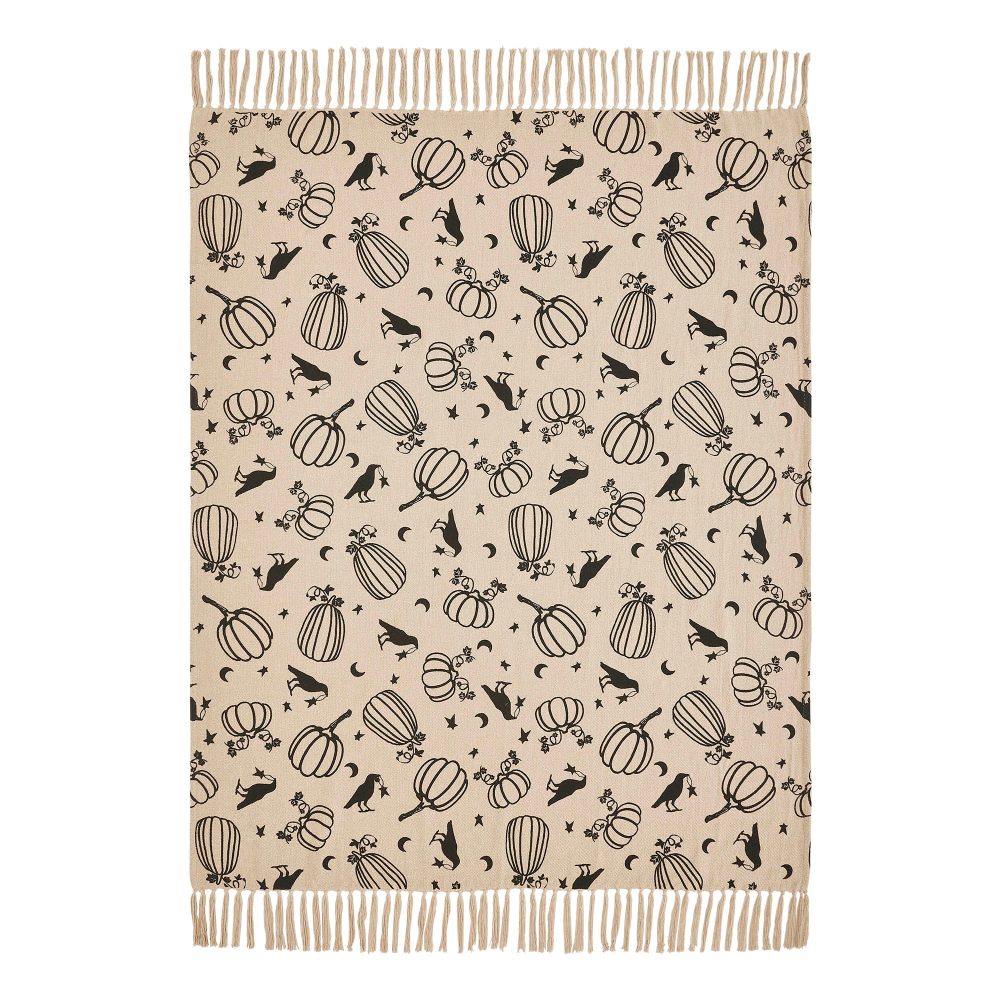 - EXCEPTIONAL CRAFTSMANSHIP & DESIGN: This VHC Brands Raven Harvest Throw measures 50×60 inches, featuring an intricately woven black pattern of whimsical ravens, harvest pumpkins, shimmering stars, and crescent moons on a natural tan backdrop, expertly crafted from sustainable recycled cotton for a soft, substantial feel; enhanced with long, luxurious tassels and designed for effortless maintenance, being both machine washable and iron safe.