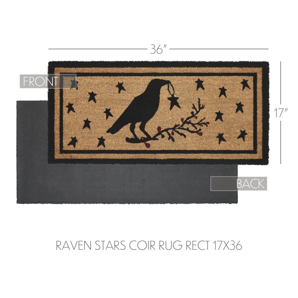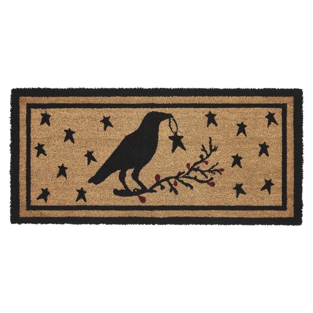 Welcome guests with rustic charm using the VHC Brands Raven Stars Coir Welcome Rug Rect 17x36. This beautifully crafted doormat features a stenciled raven perched on a branch, holding a star in its beak, surrounded by primitive stars and red berries. The intricate design, all in rustic black, is set against a natural tan background, framed by a black border for a bold and welcoming look that enhances any country or primitive-style entryway. Made from durable coir, this rug effectively traps dirt and debris, helping to keep your home clean while adding a decorative touch to your doorstep. The non-slip PVC backing provides stability, ensuring the rug stays securely in place in high-traffic areas. The raven and star motif, inspired by primitive decor, adds a whimsical yet rustic feel, making it an ideal addition to any home with a love for primitive or country themes. For easy care, shake or vacuum the rug to remove surface dirt, and to preserve its vibrant colors, place it in a sheltered entryway. The VHC Brands Raven Stars Coir Welcome Rug combines style and practicality, offering a cozy, rustic welcome while maintaining functionality and durability, making it a must-have for any farmhouse or primitive-inspired home.