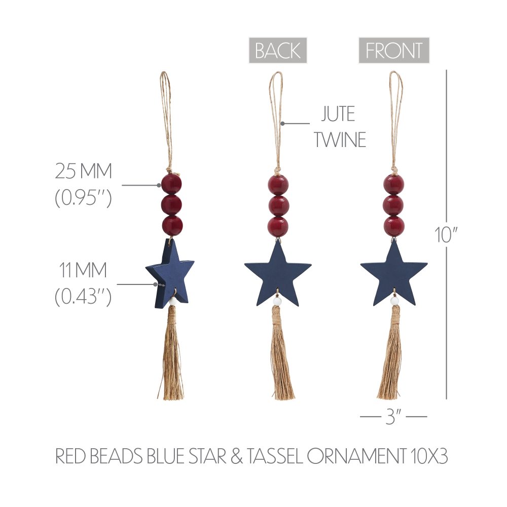Bring a touch of Americana charm to your home with the VHC Brands Patriotic Red Beads Blue Star & Tassel Ornament 10x3. This striking ornament features a hanging strand of three rich burgundy beads, leading to a bold navy blue 5-point star. The design is completed with a tan tassel tied at the bottom, offering a rustic and elegant accent to your Independence Day decor. Perfect for decorating any room, this ornament is a versatile addition to your Fourth of July celebrations or year-round Americana-inspired decor. Hang it on hooks, garlands, wreaths, or doorknobs to enhance your living room, dining room, kitchen, bedroom, or entryway. Its warm color palette and rustic aesthetic complement farmhouse and country-style interiors, adding charm and character to your space. Crafted from durable MDF and high-quality materials, the VHC Brands Patriotic Red Beads Blue Star & Tassel Ornament is designed for lasting beauty. It's easy to maintain with a quick wipe clean, ensuring it retains its vibrant colors and classic style. Whether celebrating patriotic holidays or simply showcasing your love for country, this ornament offers a timeless and stylish way to elevate your home decor.