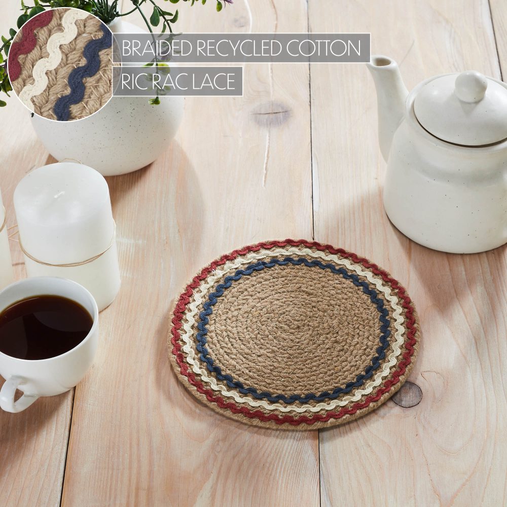 - Patriotic Design: Features a braided natural tan trivet with three colorful rick rack bands in dark red, creme, and navy blue, celebrating a festive, Americana-inspired look.