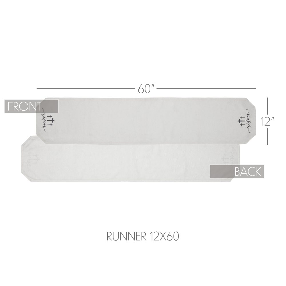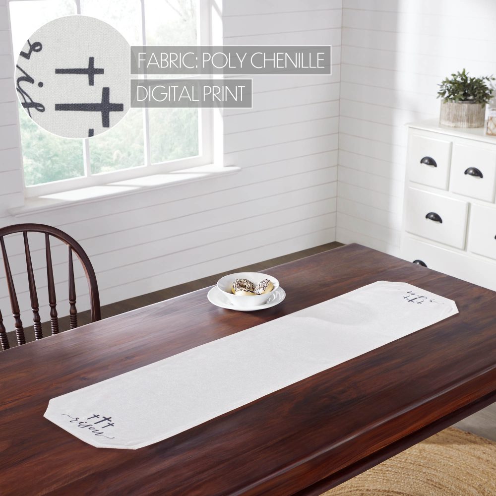• Crafted from soft white polyester, this table runner showcases a charming digital print of three crosses and proclaiming “Risen” from the Risen Collection, creating a warm and inviting atmosphere.