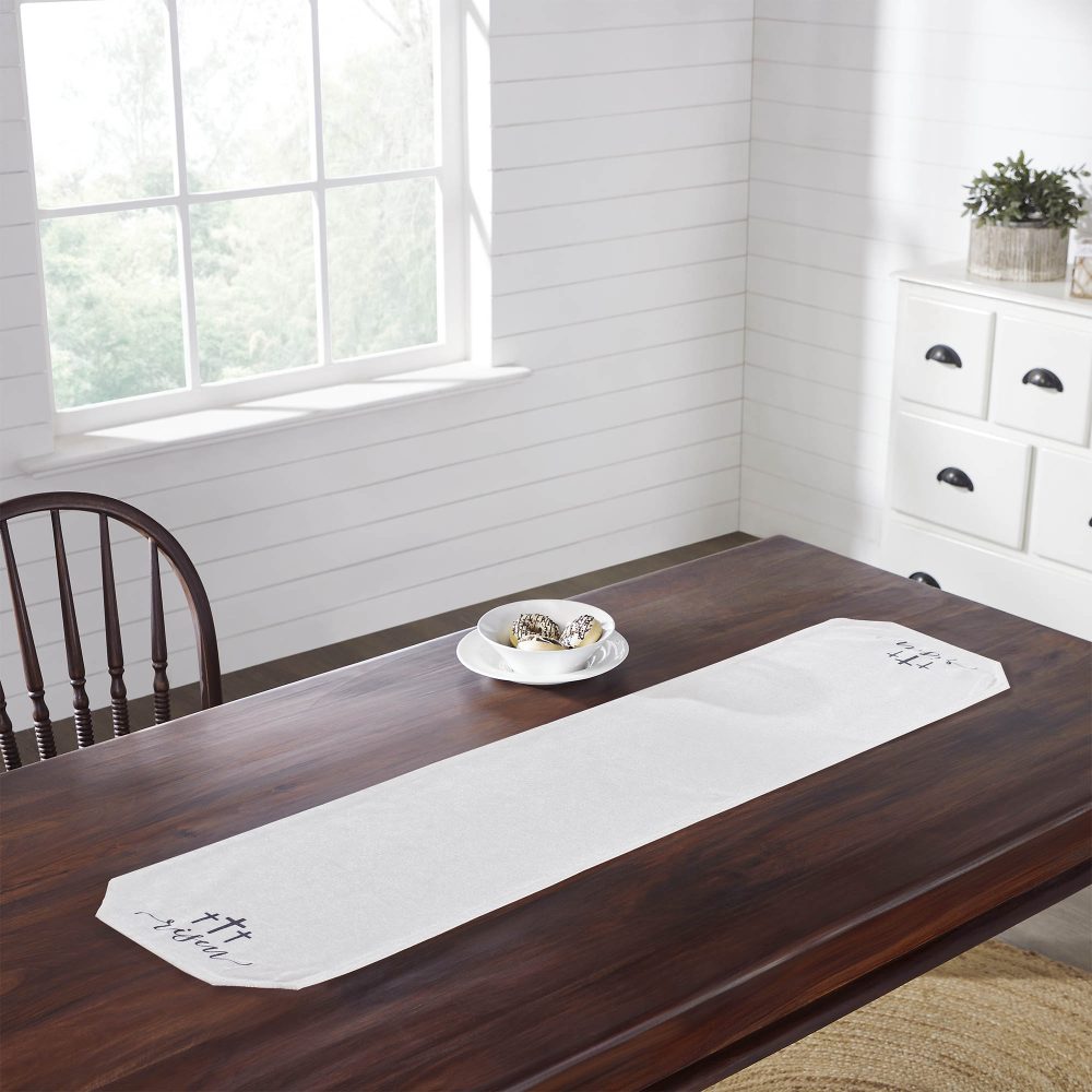 Elevate your farmhouse or country-style dining room and kitchen with the VHC Brands Polyester Runner 12x60. This charming table runner, adorned with a delicate digital print of three crosses and proclaiming "Risen" from the Risen Collection, adds a touch of rustic charm to your space. Crafted from soft white polyester, it creates a warm and inviting atmosphere, making it an ideal choice for those who appreciate fine country accents. Measuring 12x60 inches in a classic rectangular shape, this table runner features a textured design that complements your farmhouse decor. Its subtle and timeless style effortlessly enhances the aesthetics of your dining area, adding a delightful, country-inspired touch to your table. Whether you have a long rectangular table or a smaller round one, the Risen Collection table runner is a versatile and stylish addition that will beautifully adorn your space. The soft and textured polyester material not only looks cozy but also feels comfortable to the touch, providing both style and practicality for your dining or kitchen table. Embrace the charm of rural living with the Risen Collection, and let this table runner be the perfect finishing touch to your farmhouse or country-inspired interior, setting the stage for delightful meals and gatherings with family and friends.