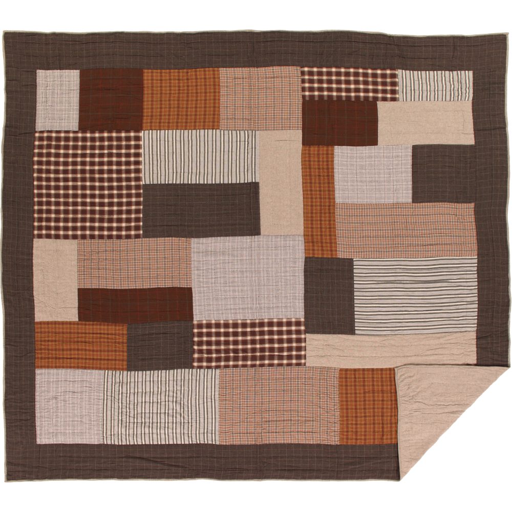 Neutral brown tones create a calming and restful respite with the Rory King Quilt. Featuring an irregular block layout and an outer border in black and tan chambray plaid, our 105Wx95L quilt invites you into a space with cozy color and warm design. The various greige, chocolate brown, and tan plaids with occasional patchwork in antique stripes provide a distinct, relaxed look for this all-cotton hand-quilted bedspread. The reverse side showcases textured greige chambray fabric.
