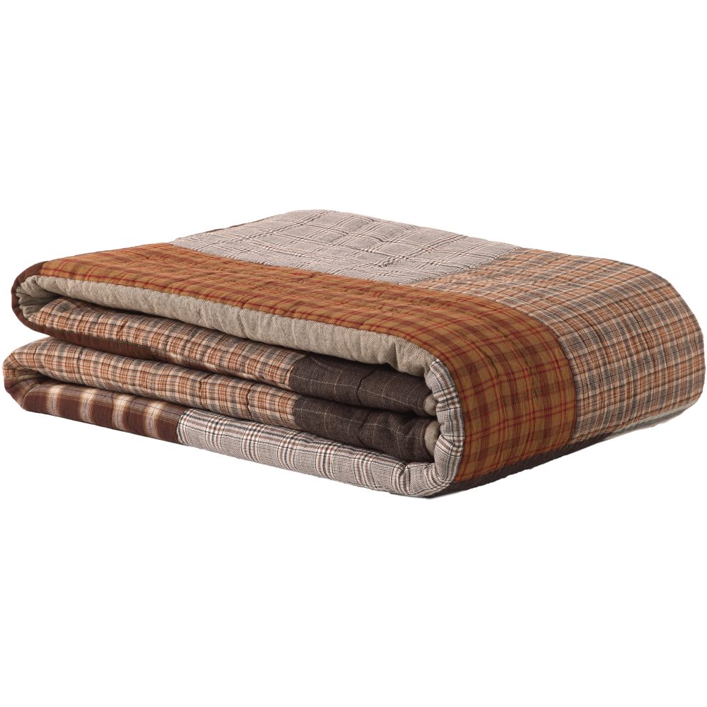 Neutral brown tones create a calming and restful respite with the Rory Queen Quilt. Featuring an irregular block layout and an outer border in black and tan chambray plaid, our 90Wx90L quilt invites you into a space with cozy color and warm design. The various greige, chocolate brown, and tan plaids with occasional patchwork in antique stripes provide a distinct, relaxed look for this all-cotton hand-quilted bedspread. The reverse side showcases textured greige chambray fabric.