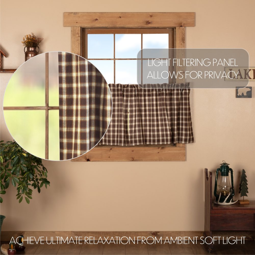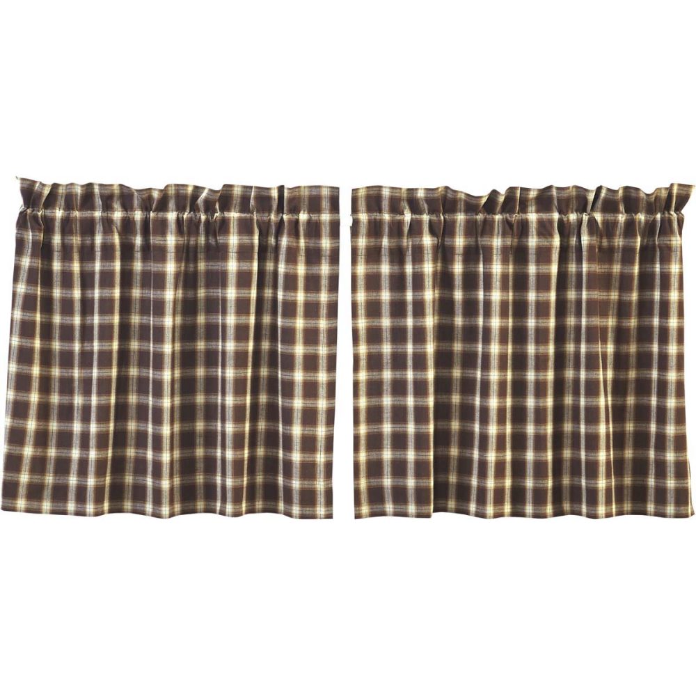 A warm, rustic blend of chocolate brown, soft creme and almond tones form a sweet, vintage plaid. The Rory Tier Set measures 24x36 inches and features a straight edge and a casual, unfussy pattern for a simple look suitable for vintage farmhouse cottages or restful lake house getaways. A generous 3.25 inch rod pocket and loops allows for easy hanging.