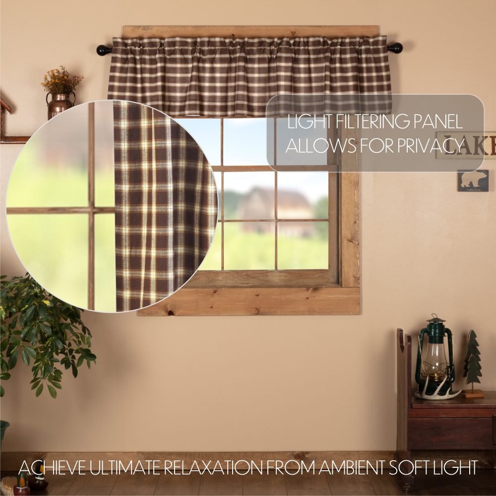 A warm, rustic blend of chocolate brown, soft creme and almond tones form a sweet, vintage plaid. The Rory Valance measures 16x72 inches and features a straightedge and a casual, unfussy pattern for a simple look suitable for vintage farmhouse cottages or restful lake house getaways. A generous 3.25 inch rod pocket and loops allows for easy hanging.