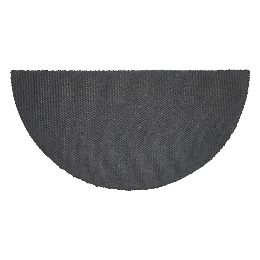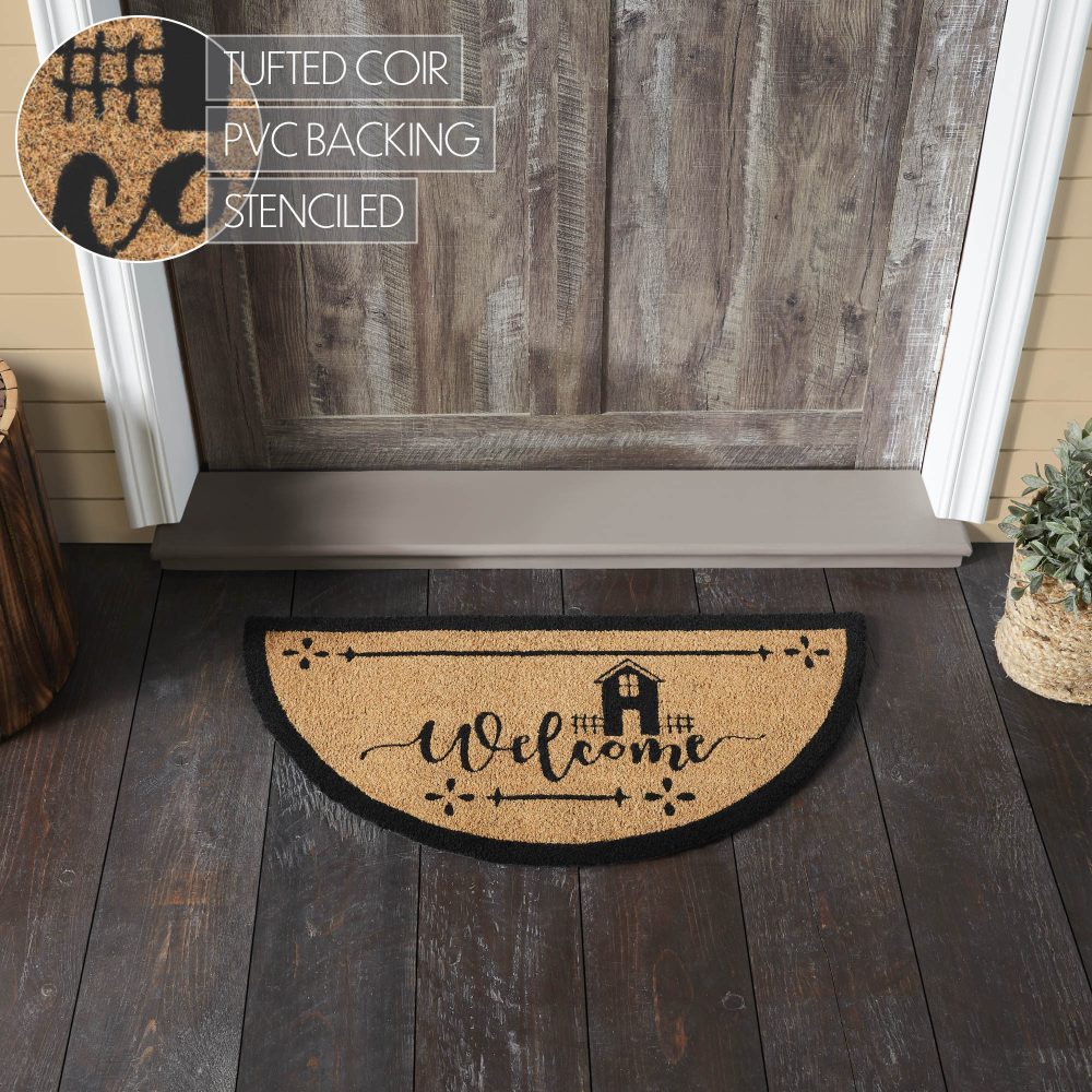 Welcome guests with rustic charm using the VHC Brands Saltbox Coir Welcome Rug Half Circle 16.5x33. This beautifully crafted doormat features a stenciled saltbox house and fence alongside a warm "Welcome" greeting, all in country black against a natural tan coir background. The design is framed by a subtle bar and droplet pattern, adding a unique decorative touch that perfectly complements farmhouse or primitive-style decor. Ideal for high-traffic entryways, this coir rug is designed to trap dirt while adding a cozy, homestyle feel to your home. The half-circle shape fits neatly against your doorstep, and the non-slip PVC backing ensures stability, keeping the rug securely in place. With its primitive design and welcoming message, this rug creates an inviting atmosphere for family, friends, and guests alike. For easy maintenance, simply shake or vacuum to remove surface dirt and keep the colors vibrant by placing the rug in a sheltered entryway. The VHC Brands Saltbox Coir Welcome Rug combines rustic elegance with practical functionality, making it a perfect addition to your entryway or porch, offering both style and everyday utility to your home.