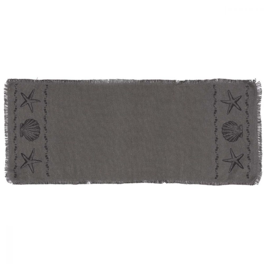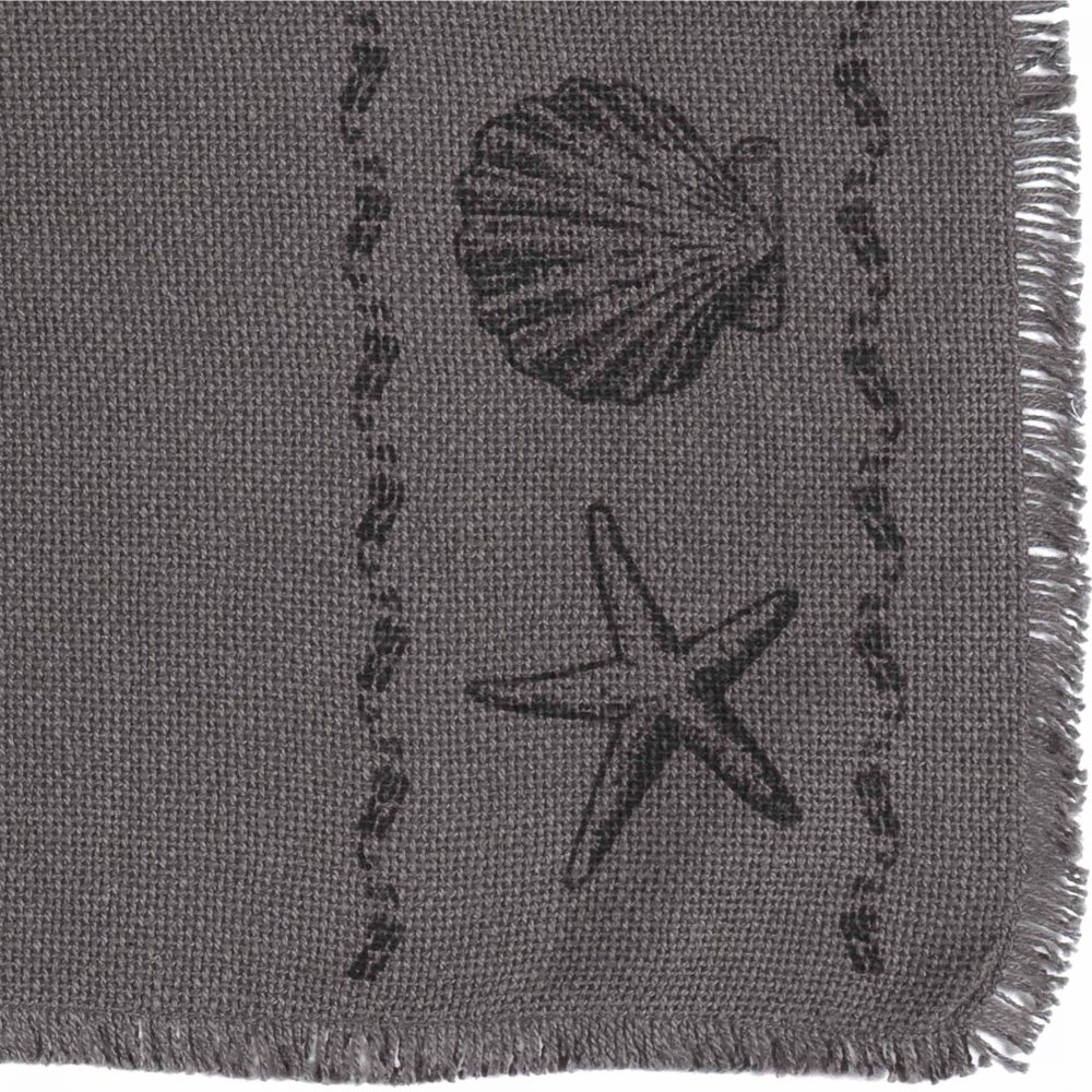 The Sandy Grey Burlap Runner 13x36 decorates your farmhouse table with seaside sophistication. Showcasing starfish and seashell stencils on both ends accented with charcoal wave borders on dark grey cotton burlap with fringed edges for added texture and style.