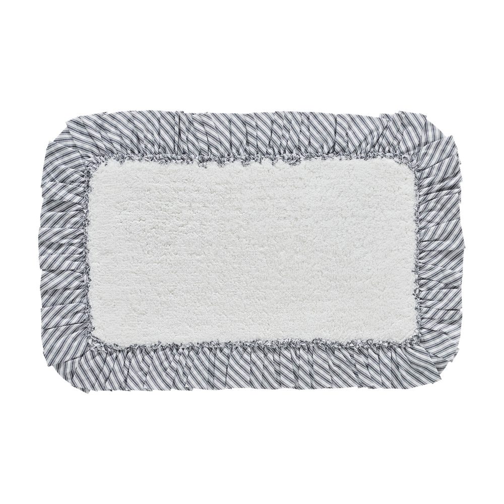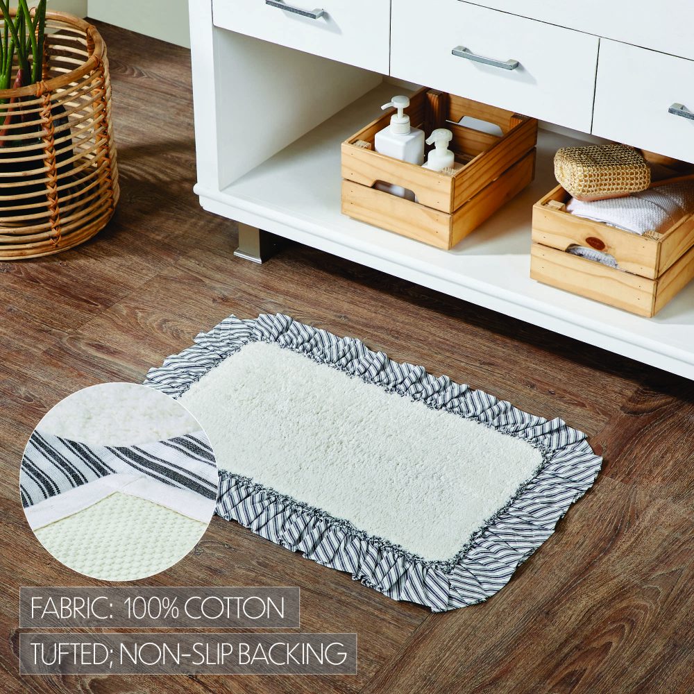 Step out of the shower and into cozy country farmhouse bliss. The Sawyer Mill Black Bath Mat 20x30 features a solid creme core in premium, ultra absorbent cotton. It is trimmed with a ruffled striped fabric in country black and soft white. Backed with textured rubber to produce a quality, non-slip surface without the need for a separate rug pad. This ruffled bath mat is a great finishing piece for bathrooms or laundry rooms where you need the perfect balance of style and functionality.