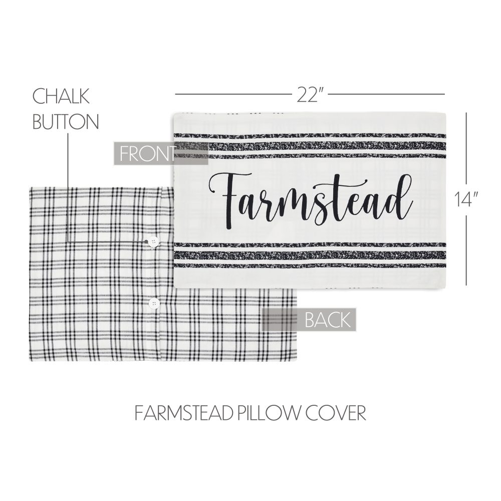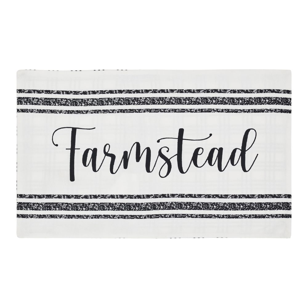 Distressed details and black and white word art create modern farmhouse style with this 14x22 throw pillow cover. The Sawyer Mill Black Farmstead Pillow Cover features a white base with artfully styled word art. Distressed horizontal stripes showcase a loopy script reading, farmstead in country black. Pair this country chic decorative pillow with additional black and white decor to quickly transform your entire living room or add to an entryway bench for a little taste of country style to welcome guests. For a farmhouse look with the quality you've come to expect from over 25 years of happy customers, pair with other classic home staples and accessories from the Sawyer Mill Collection by VHC.