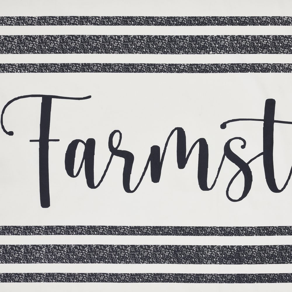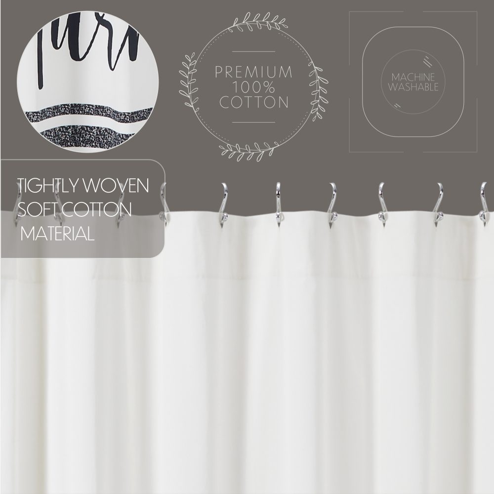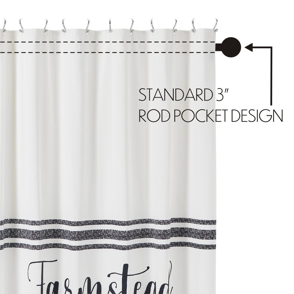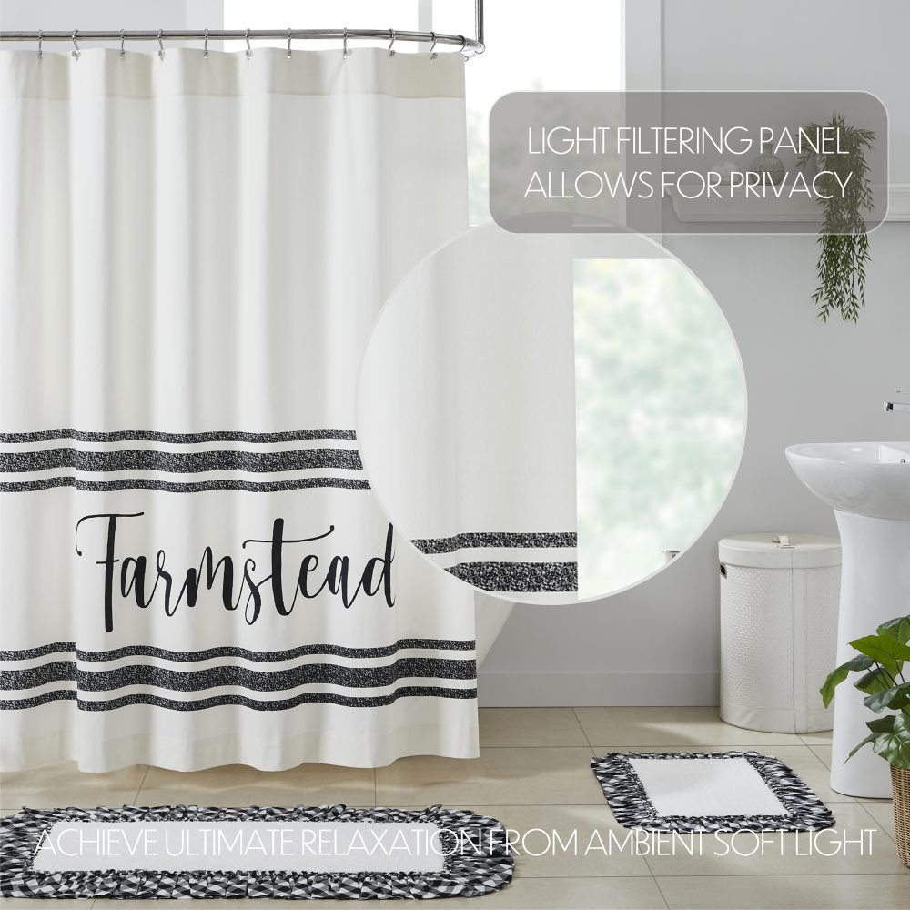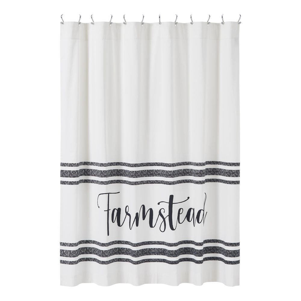 Soft white cotton and country black stenciling create a design to capture the essence of modern farmhouse decor. The Sawyer Mill Black Farmstead Shower Curtain features a soft white twill with wide country black stenciling along the bottom. Wide striping showcase decorative word art of "Farmstead" in an elegant script. Measures 72 by 72 inches to fit standard sized showers and baths. Easily hang this classic country bath curtain with shower hooks of your choosing (not included) using the button holes attached. A 3" rod pocket is also available as an alternative hanging method.
