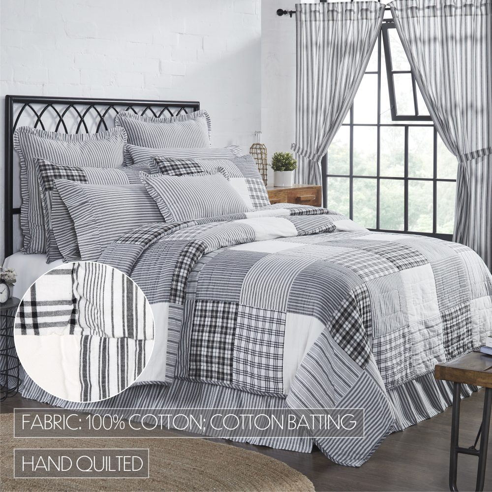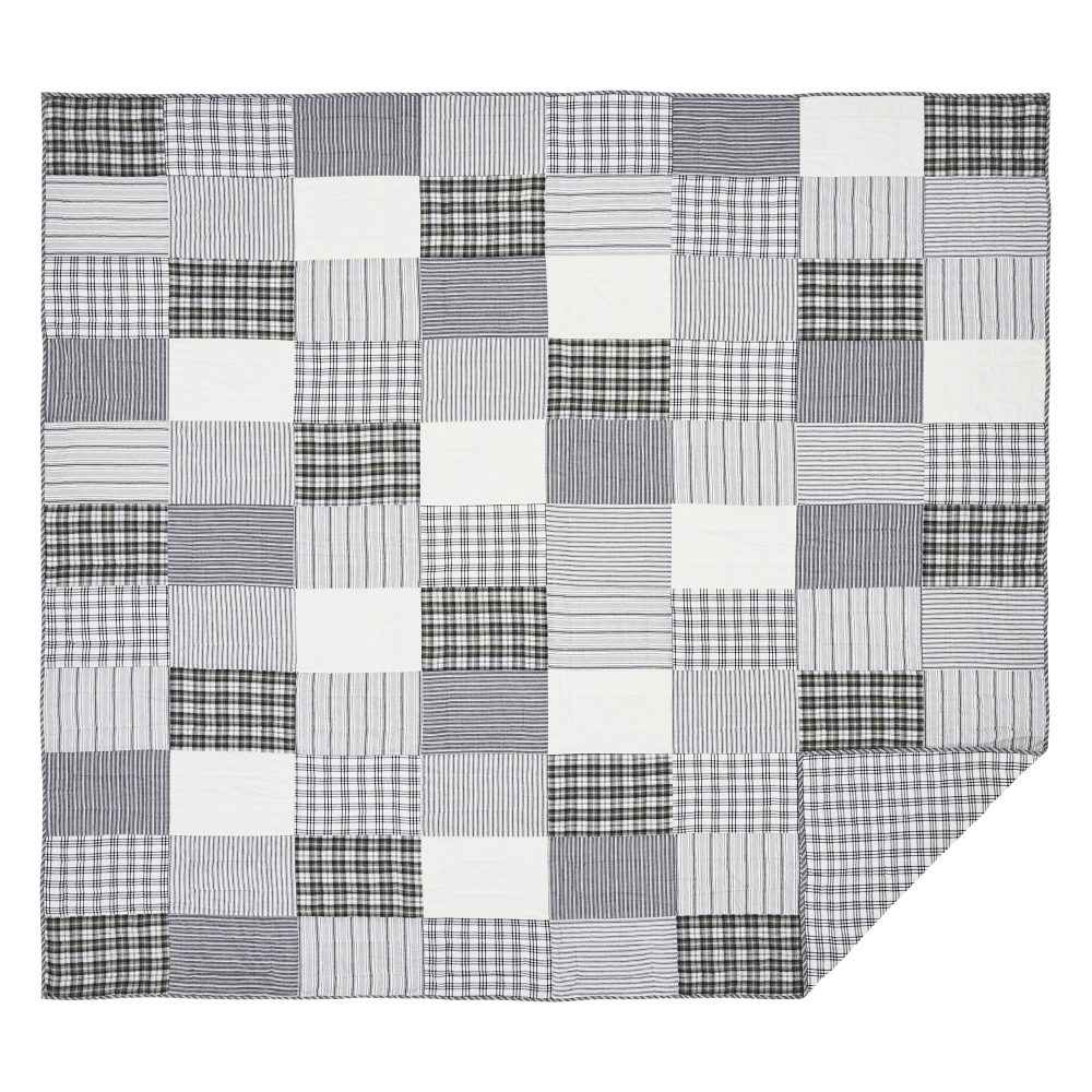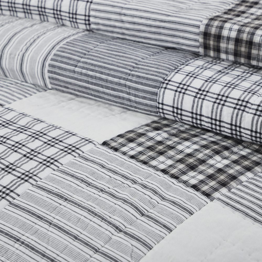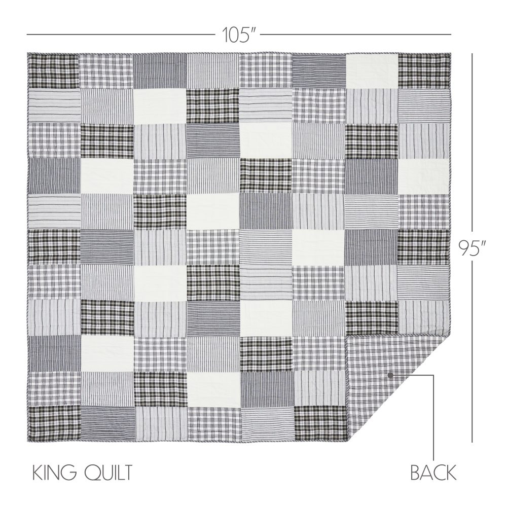 Capture the feel of modern farmhouse decor with a classic patchwork quilt in simple black and white patterns. The Sawyer Mill Black King Quilt measures 105 by 95 inches and features hand stitching for a superior finish built to last. The country chic quilt includes a mix of plaids, stripes, and solid blocks. Reverses to a simple black and white windowpane plaid. Constructed from 100 percent cotton, this soft quilted bedspread is machine washable and iron safe. Coordinates with the Sawyer Mill Collection by VHC for classic farmhouse style and the quality you can expect from over 20 years of happy customers.