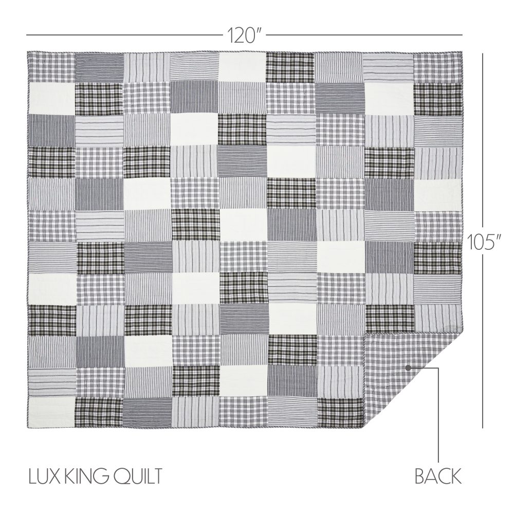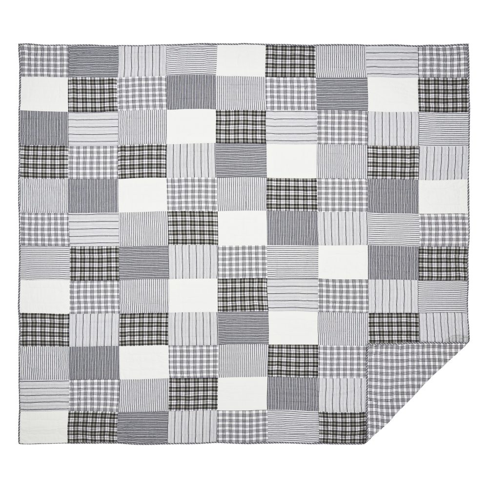 Capture the feel of modern farmhouse decor with a classic patchwork quilt in simple black and white patterns. The Sawyer Mill Black Luxury King Quilt measures 120 by 105 inches and features hand stitching for a superior finish built to last. The country chic quilt includes a mix of plaids, stripes, and solid blocks. Reverses to a simple black and white windowpane plaid. Constructed from 100 percent cotton, this soft quilted bedspread is machine washable and iron safe. Coordinates with the Sawyer Mill Collection by VHC for classic farmhouse style and the quality you can expect from over 20 years of happy customers.
