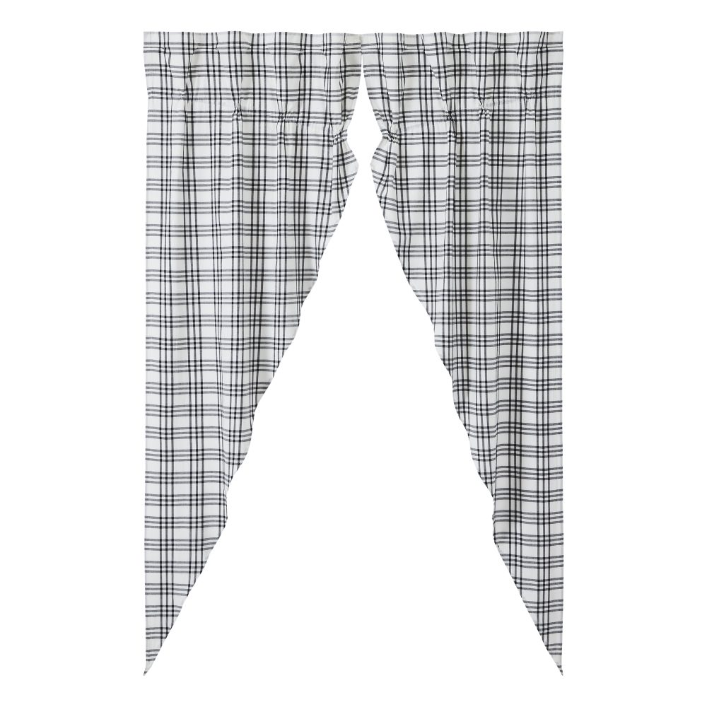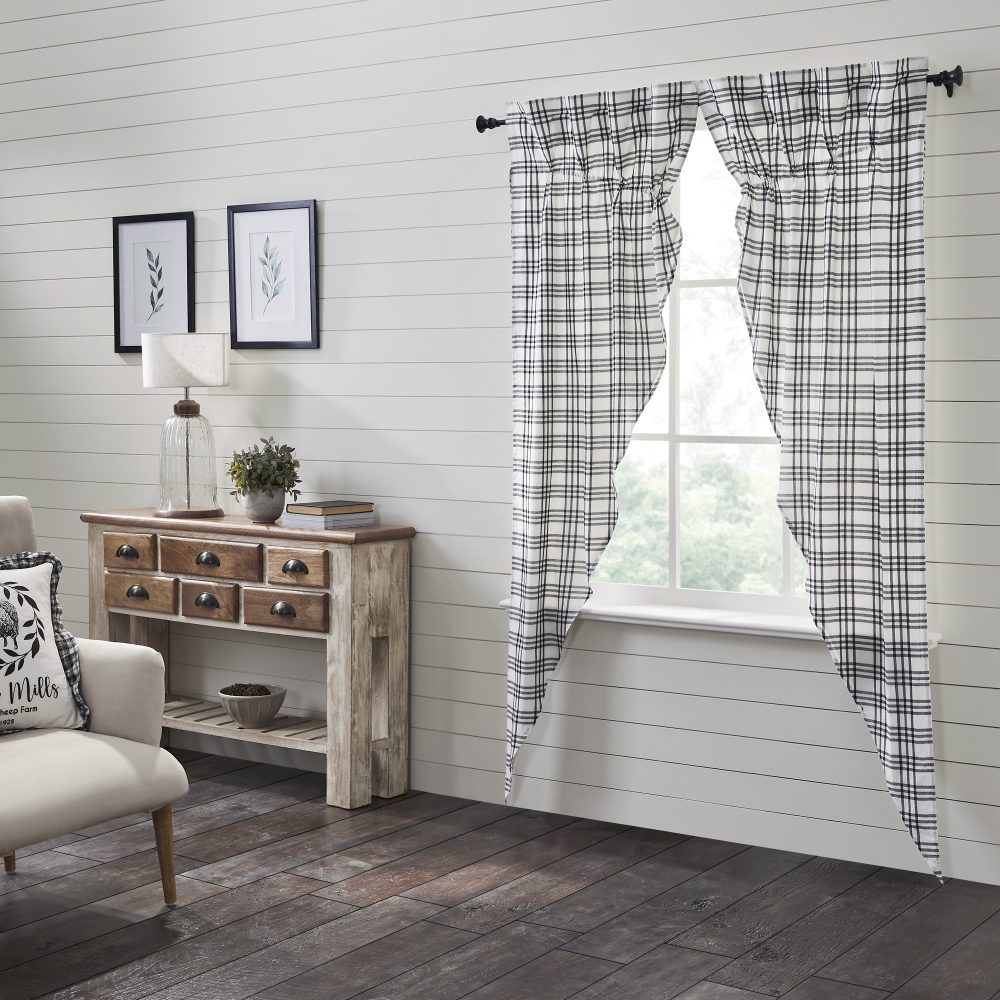 The Sawyer Mill Black Plaid Prairie Long Panel Set creates a relaxed country feel for your home. Featuring classic country black and soft white plaid, these curtains are a versatile choice for accenting vintage kitchens, farmhouse laundry rooms, and more. The gracefully angled drapes perfectly frame windows providing a bit of polish for your home. Our fully lined prairie panels come with built in drawstrings to adjust each panel to meet your style needs, along with a curtain rod pocket for easy hanging.