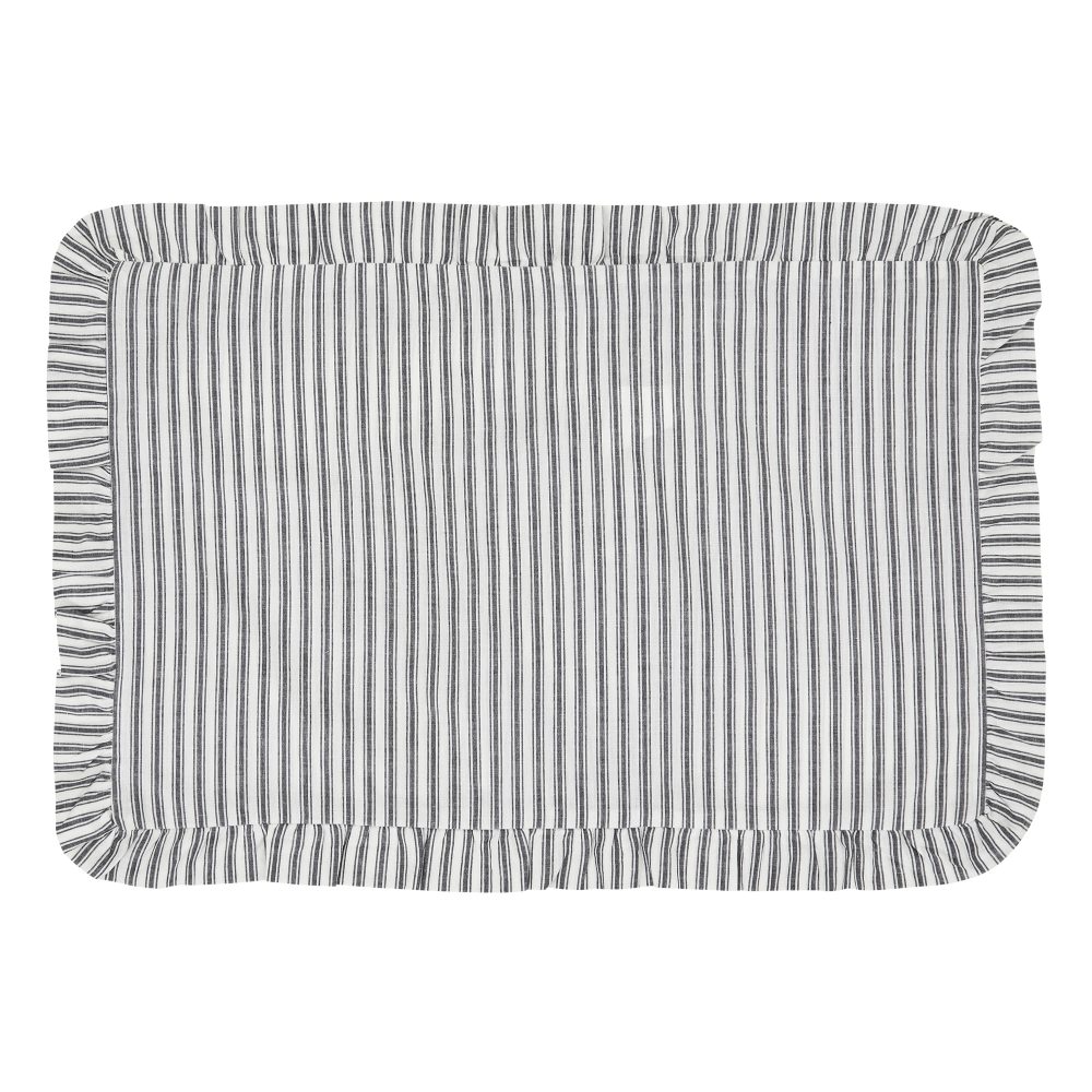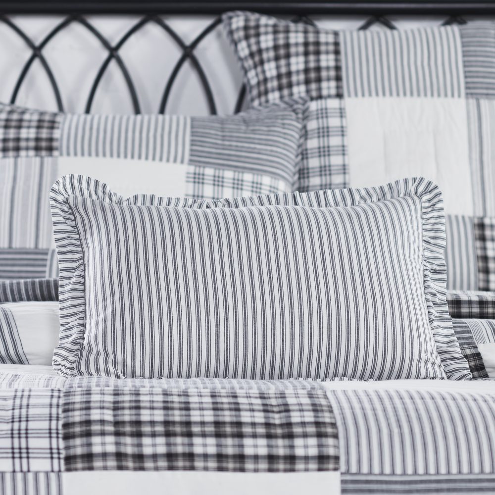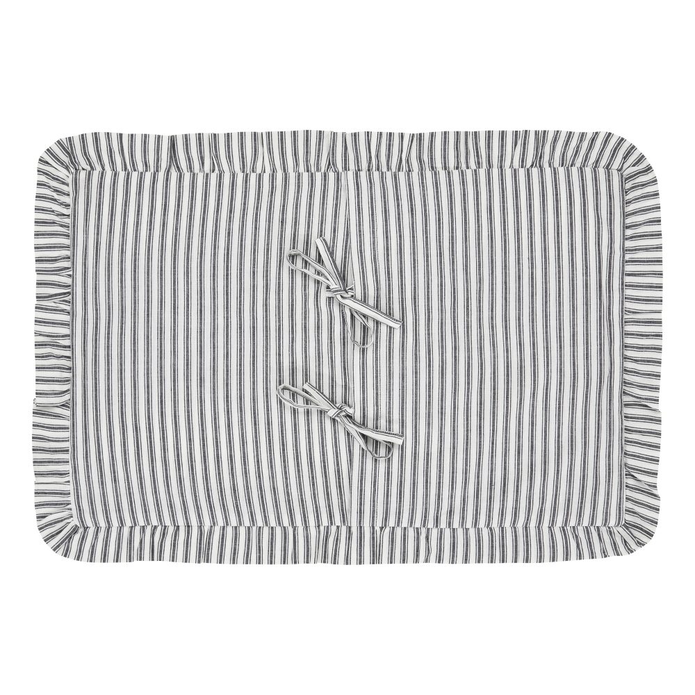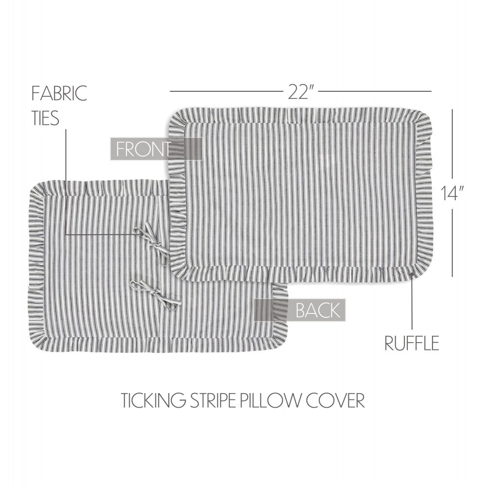 Neutral black and white ticking stripe fabric adds a subtle touch of class wherever it is placed. The Sawyer Mill Black Ruffled Ticking Stripe Pillow Cover features this iconic farmhouse pattern on both the front and back. A ruffled edge and tie-style closures add a feminine touch to this classic country throw pillow cover. Add to an entryway bench, a cozy reading chair, or as a finishing touch to farmhouse bedding. This accent pillow cover is a deeply versatile piece of home decor. Measures 14x22 inches and is made from 100 percent cotton with double-sewn seams for added durability. Does not include fill. For a farmhouse look with the quality you've come to expect from over 25 years of happy customers, pair with other classic home staples and accessories from the Sawyer Mill Collection by VHC.