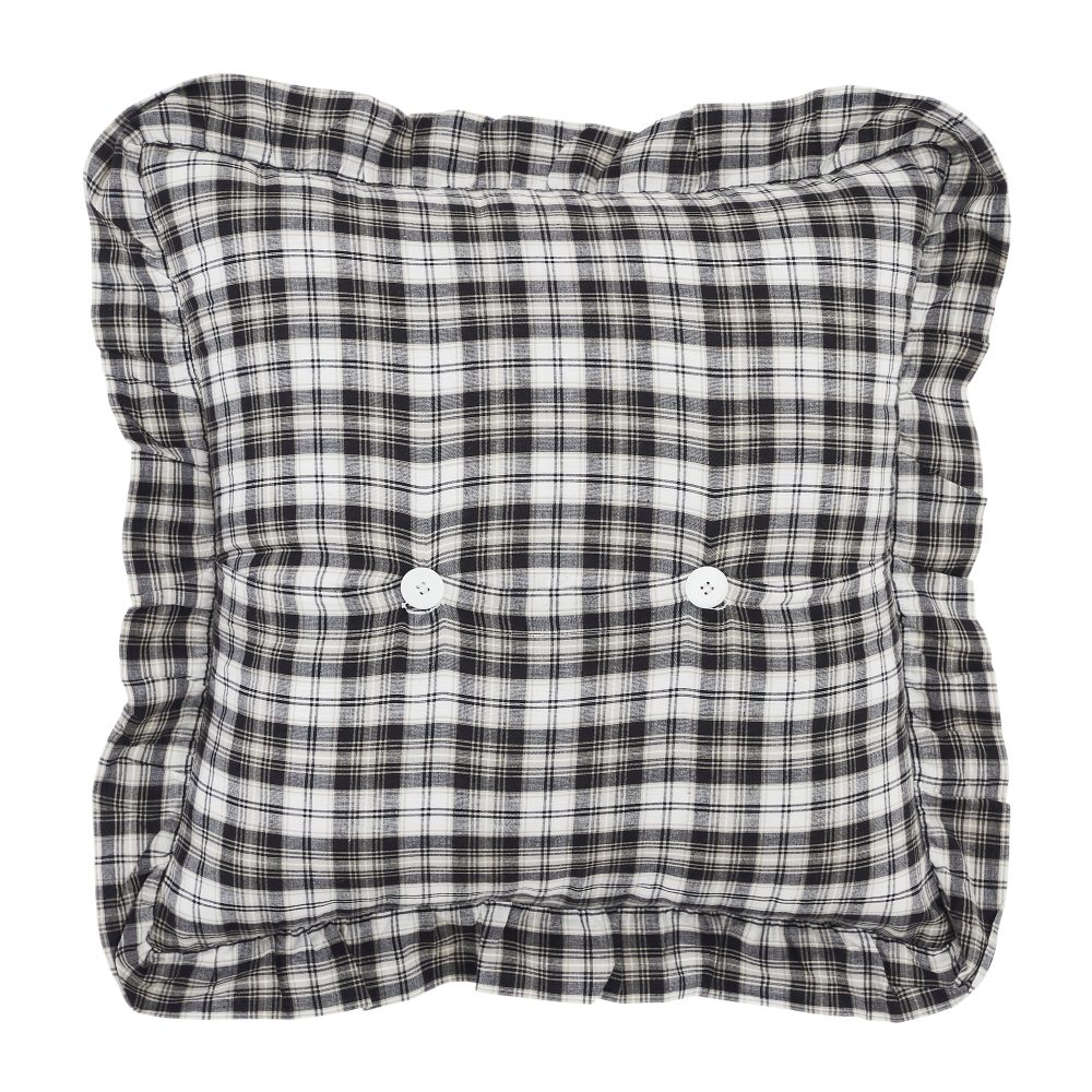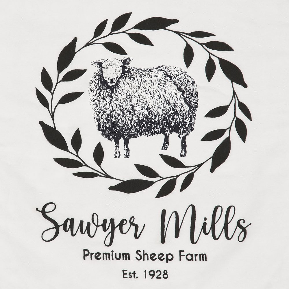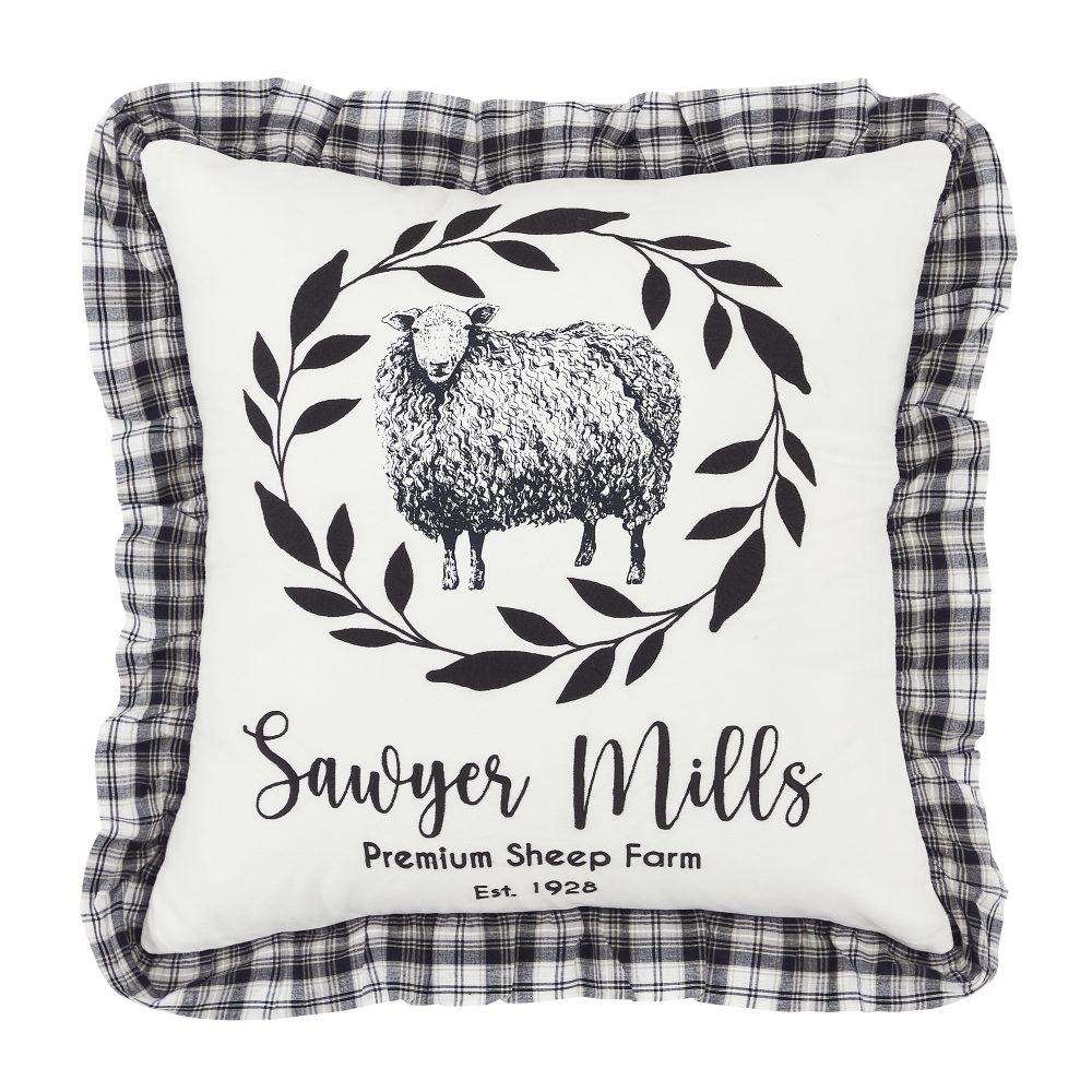 Craft a modern farmhouse with simple, uncluttered designs from the Sawyer Mill Collection. The Sawyer Mill Black Sheep Pillow measures 18 by 18 inches and features a neutral black and white color scheme. The comfortable, 100 percent cotton accent pillow features a detailed stenciling of a sheep with a decorative wreath and scripted font reading, "Sawyer Mills". Reverses to a classic plaid with button-style closures for easy cleaning and alternate styling options. A generous ruffled edging softens the look. Machine washable and iron safe. Designed to coordinate with the Sawyer Mill Black Collection from VHC for a complete black and white look with modern farmhouse style.