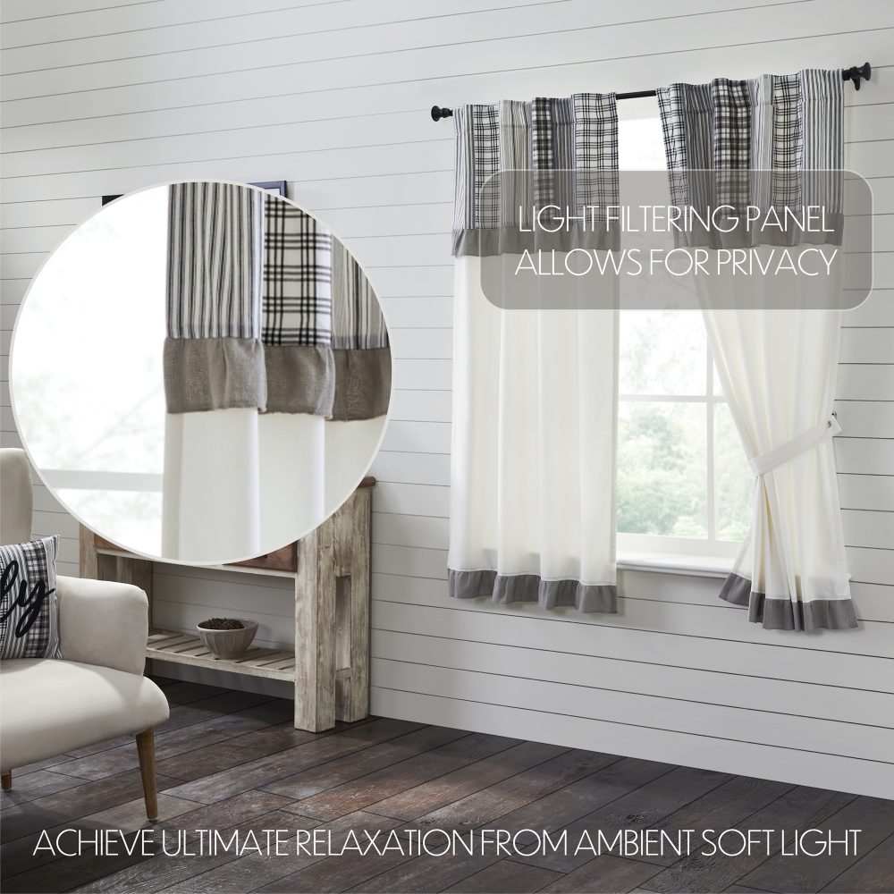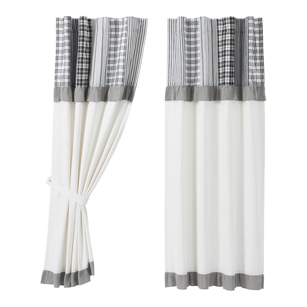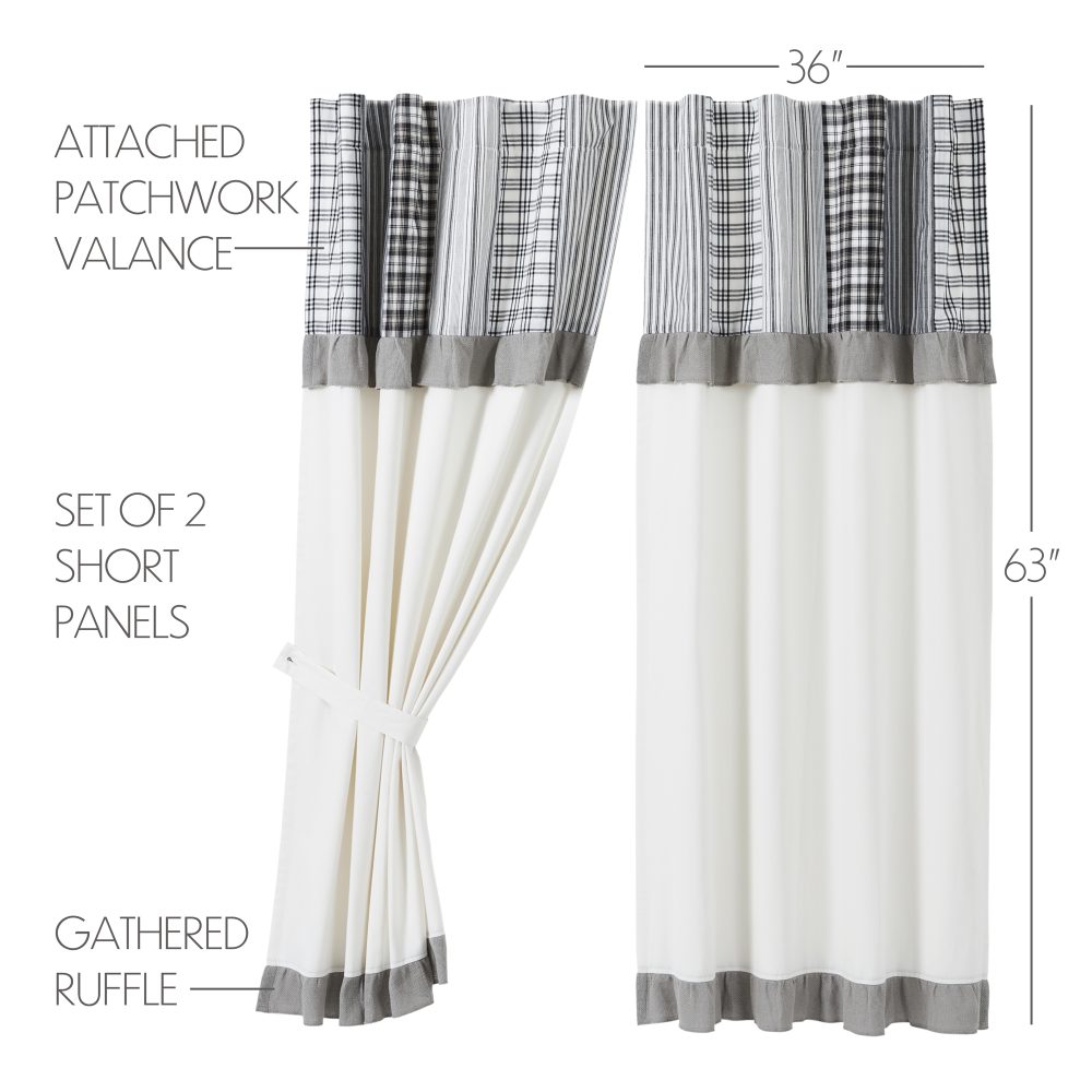 A mix of stripes and plaids comes together to create a farmhouse look that proves that neutral doesn't have to be boring. The Sawyer Mill Black Short Panel with Attached Patchwork Valance Set of 2 63x36 features a mix of black and white patterns with two thick bands of ruffled grey. The base of the panels features a soft white, lined fabric creating contrast with the attached valance. Includes a rod pocket and optional loops to allow for easy hanging along with matching tie backs.