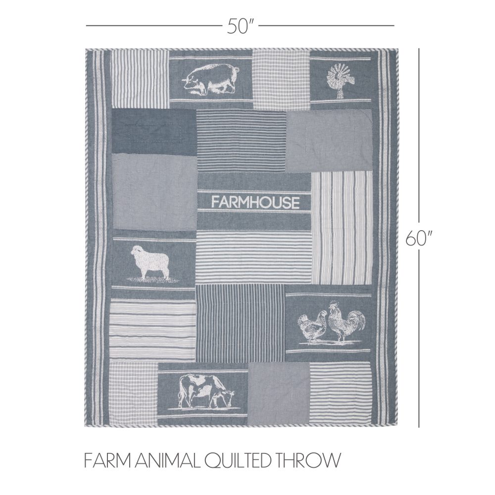 Mismatched patchwork blocks in a variety of simple denim blue and white plaids and stripes complement stenciled accents to create a modern farmhouse look you're sure to love. The Sawyer Mill Blue Farm Animal Quilted Throw measures 60x50 inches and adds country chic style to any sofa, chair or wall. The detailed throw features a soft, quilted design with rectangular blocks in a variety of sizes and a thin, striped border. A central block features word art stenciling in a bold font reading, farmhouse. Smaller blocks sprinkled throughout the patchwork include classic farm scenes, including livestock and a windmill, in clean white stenciling for a bright farmhouse feel. The premium lap blanket is machine washable and iron safe and crafted in 100 percent cotton for a soft feel and durable wear. Reverses to a simple blue and white ticking stripe for alternate styling. Coordinates with the Sawyer Mill Collection by VHC for matching modern farmhouse window treatments, bathroom accessories and bedding to bring the best of eye-catching, country style to every corner of your home.