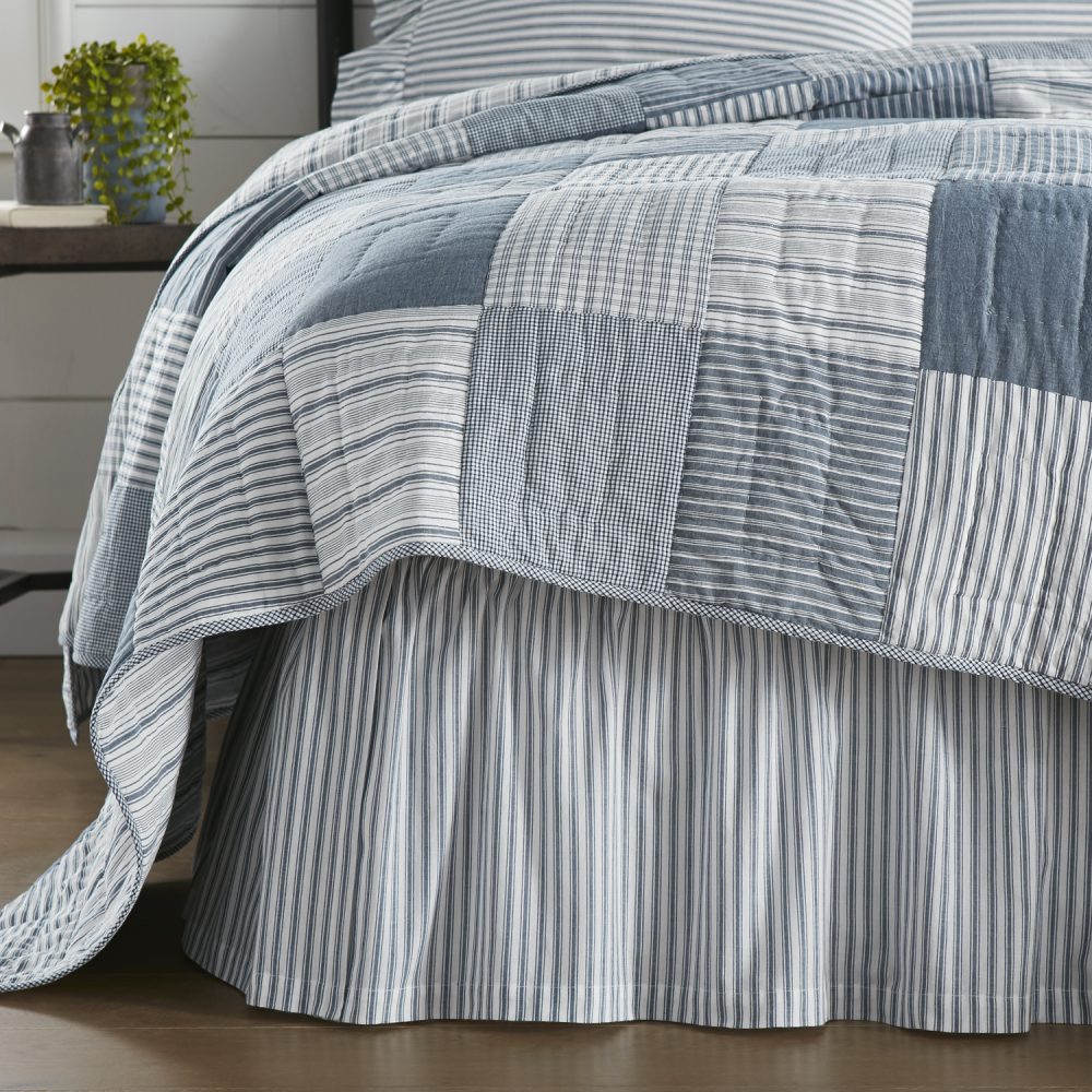 Capture classic farmhouse style with neutral colors and timeless patterns. The Sawyer Mill Blue Ticking Stripe Queen Bedskirt 60x80x16 completes the look of your modern country farmhouse bedding with deep denim blue and cotton white stripes in a traditional ticking stripe pattern. This cotton dust ruffle is the perfect blend of practical and stylish. Features a long 16-inch drop to ensure that the fabric reaches your floor for a neat, put-together look that blocks under-bed storage from view while also keeping dust out of hard-to-reach areas. VHC bedskirts are also designed with split corners and slight ruffling for less fuss and a great fit every time. Coordinates with the Sawyer Mill Collection by VHC for a complete modern farmhouse look for your bedroom featuring soft plaids and clean stripes in neutral, easy-to-match colors. Machine washable and iron safe.