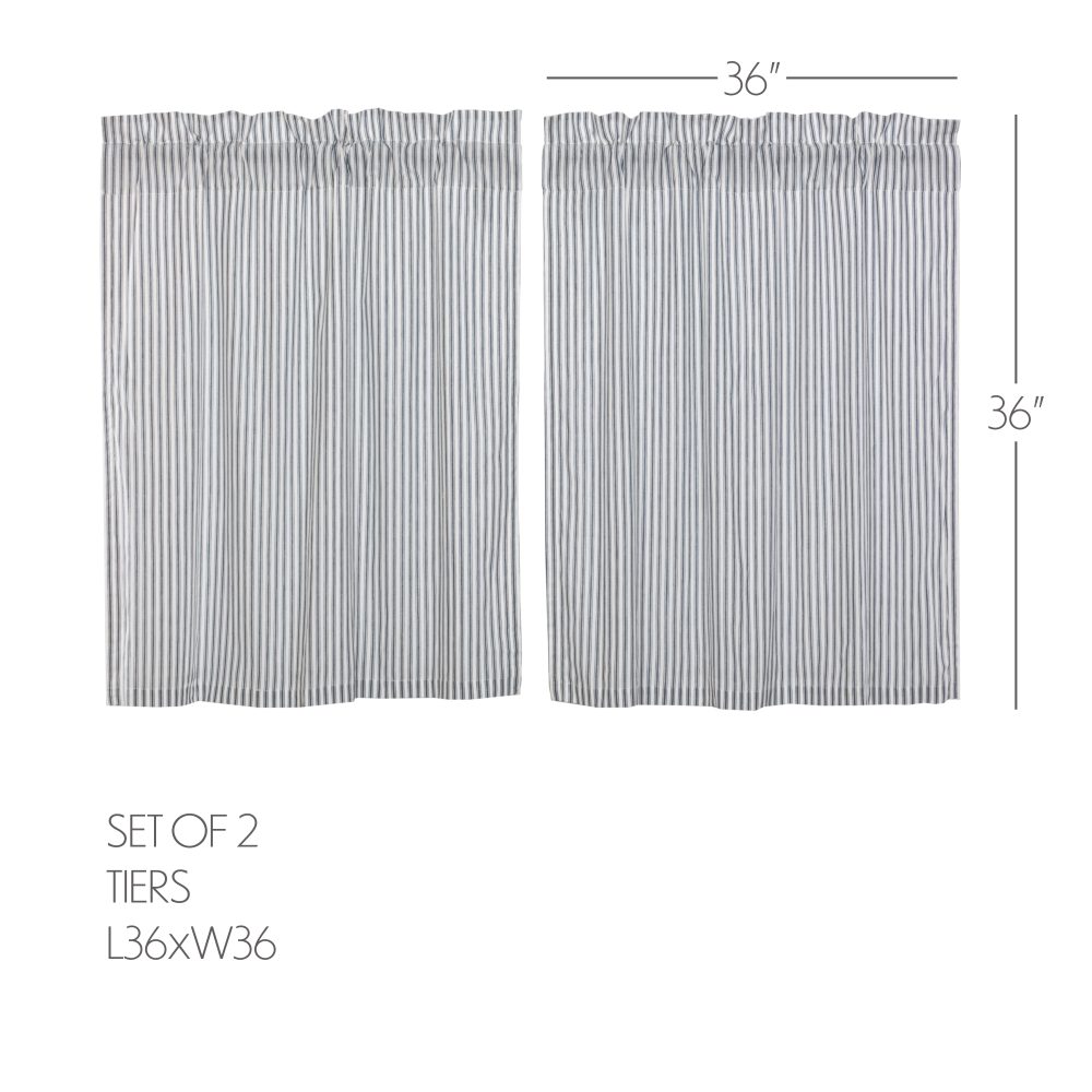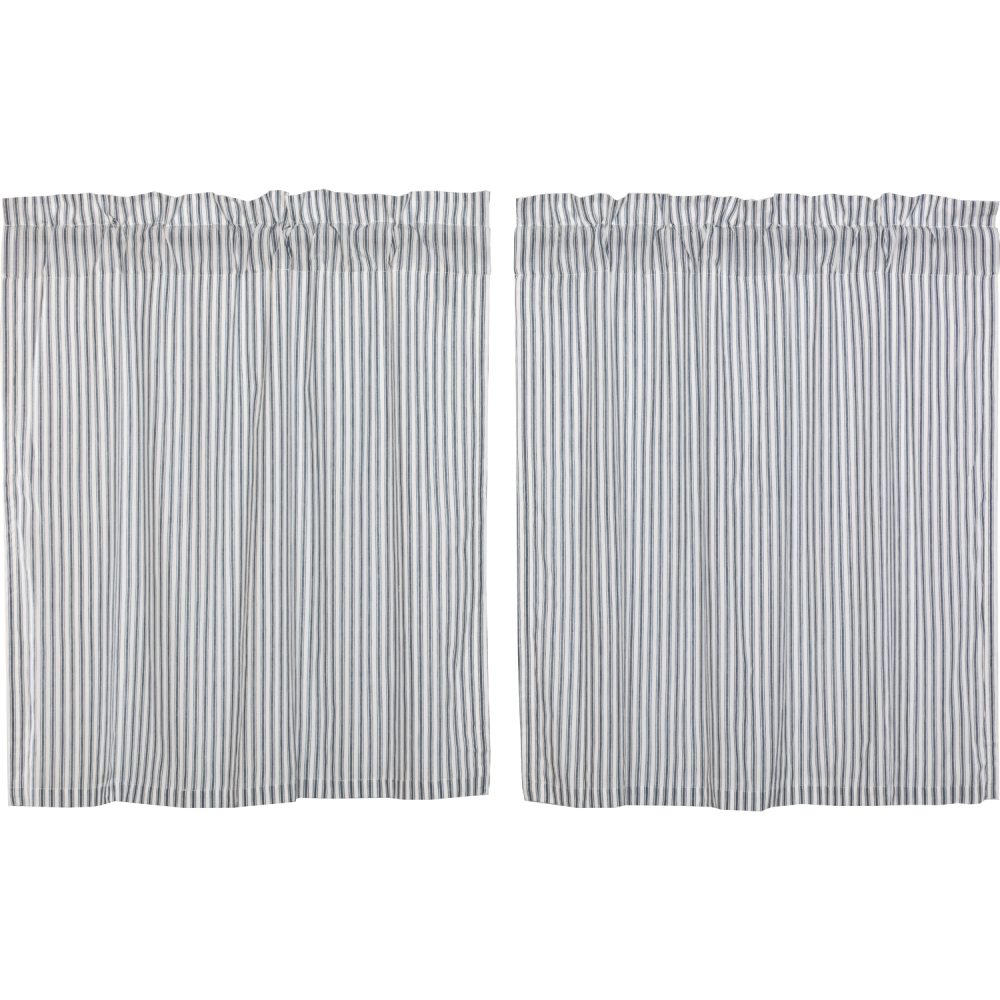 Create the perfectly charming country window of your dreams with these 36 x 36 inch tier-style curtains. Featuring denim blue and soft white ticking stripes, the Sawyer Mill Blue Ticking Stripe Tier Set provides just the right balance of privacy and sunshine. Pair with a matching valance or prairie swag for a fully decorated look or alone for a simple pop of color and character. Also known as cafe or bistro curtains, these are a particularly good fit for decorating farmhouse kitchens, laundry rooms, and small bathroom windows.