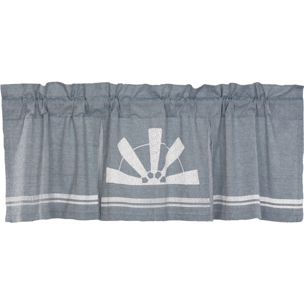 The Sawyer Mill Blue Windmill Valance Pleated 20 x 60 on 100% cotton chambray takes farmhouse decor to a whole new level with a vintage blue background showcasing a soft white windmill giving you that down-home on the farm feel. Finished with inverted pleats and striping at the bottom for a touch of country charm. Features a soft, white cotton lining that helps to prevent fading and filters sunlight while a 3.25
