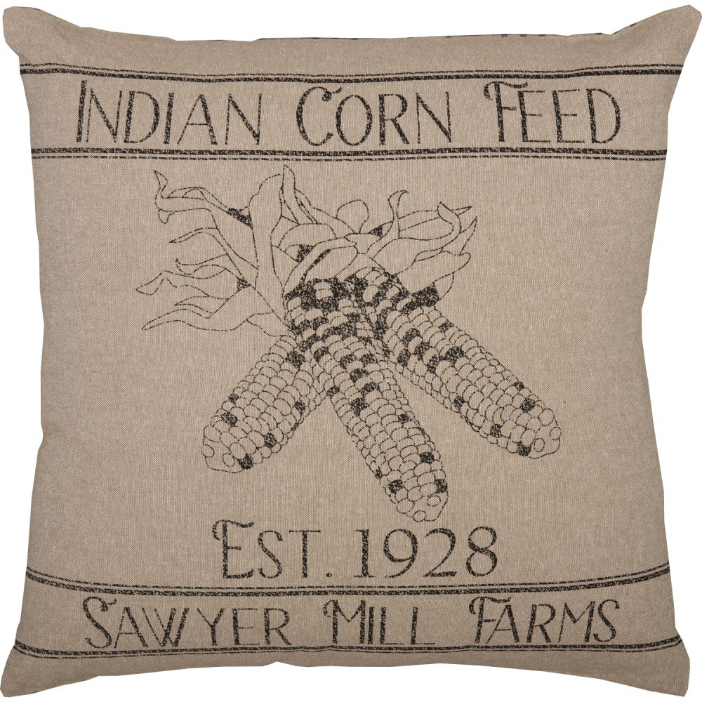Begin your fall home refresh with the inviting embrace of our 18x18 Sawyer Mill Corn Feed Grain Sack Throw Pillow. Each pillow whispers tales of autumn, featuring a distinctive stencil corn feed design set against the rich, earthy tones of tan and black plaid. This piece effortlessly captures the heartwarming essence of a farmhouse harvest, offering a touch of nostalgic charm that feels both authentic and comforting. Crafted for both beauty and versatility, this plump pillow is fully reversible, offering a fresh new farmhouse look with a simple turn, secured by classic button closures. Toss it onto a weathered wooden bench in your entryway, instantly creating a heartfelt welcome for guests, or nestle it amongst your living room furniture to infuse the space with an irresistible cozy warmth. Perfectly poised to blend with any of VHC Brands' Fall Farmhouse Collections, it's an essential touch for holiday cheer and enduring country elegance.