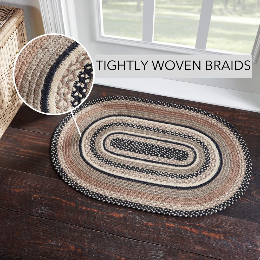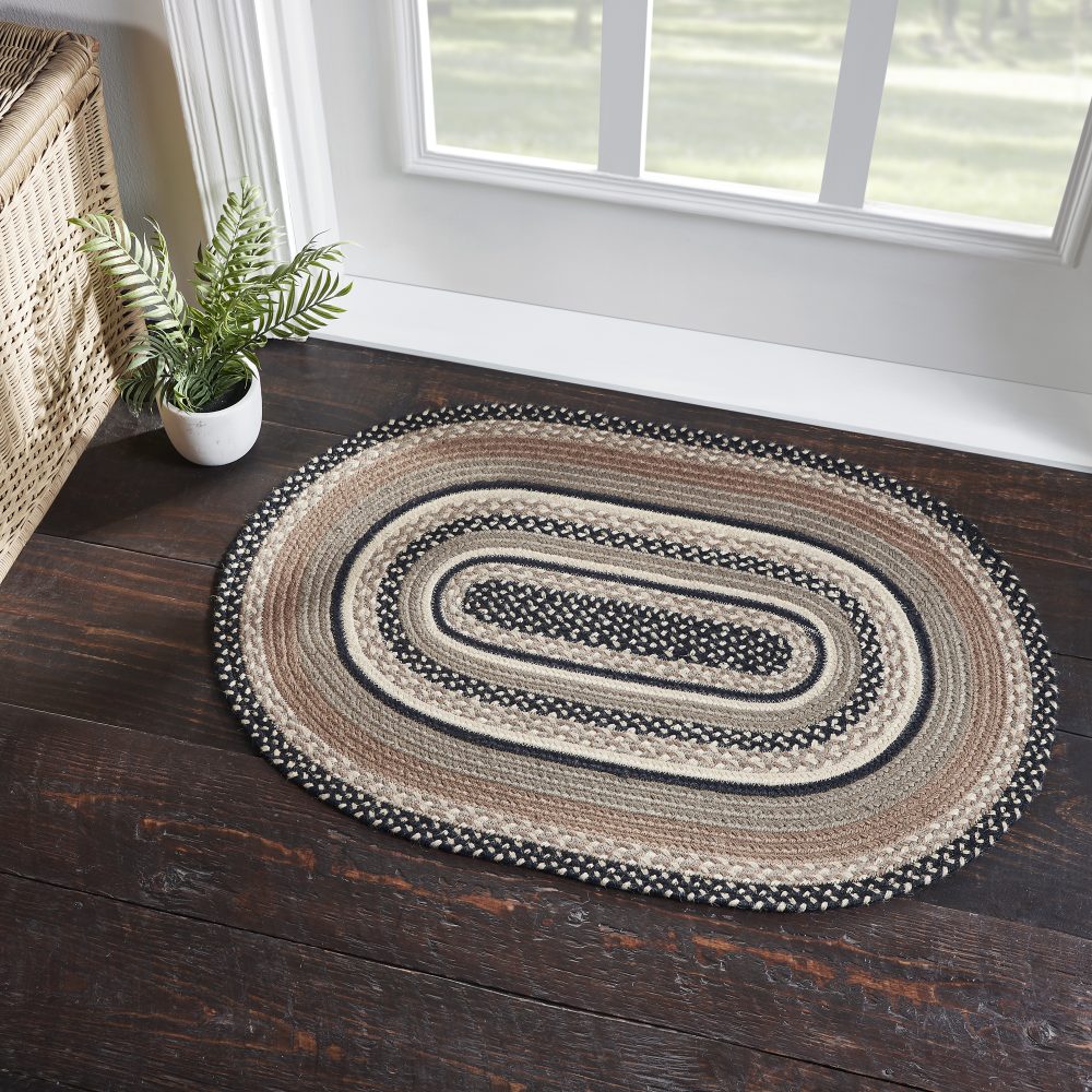 Add modern farmhouse charm to your home with simple, neutral colors in a curl-resistant jute blend that adds style and safety anywhere a mid-size accent rug is needed. The Sawyer Mill Charcoal Creme Jute Rug measures 24x36 inches and features a classic oval shape and tight braids constructed with a durable jute blend. The special blend relaxes faster and stays flat. Features a blend of bleached white, asphalt black, and grey taupe for a modern, neutral look that complements a wide array of country farmhouse decor.