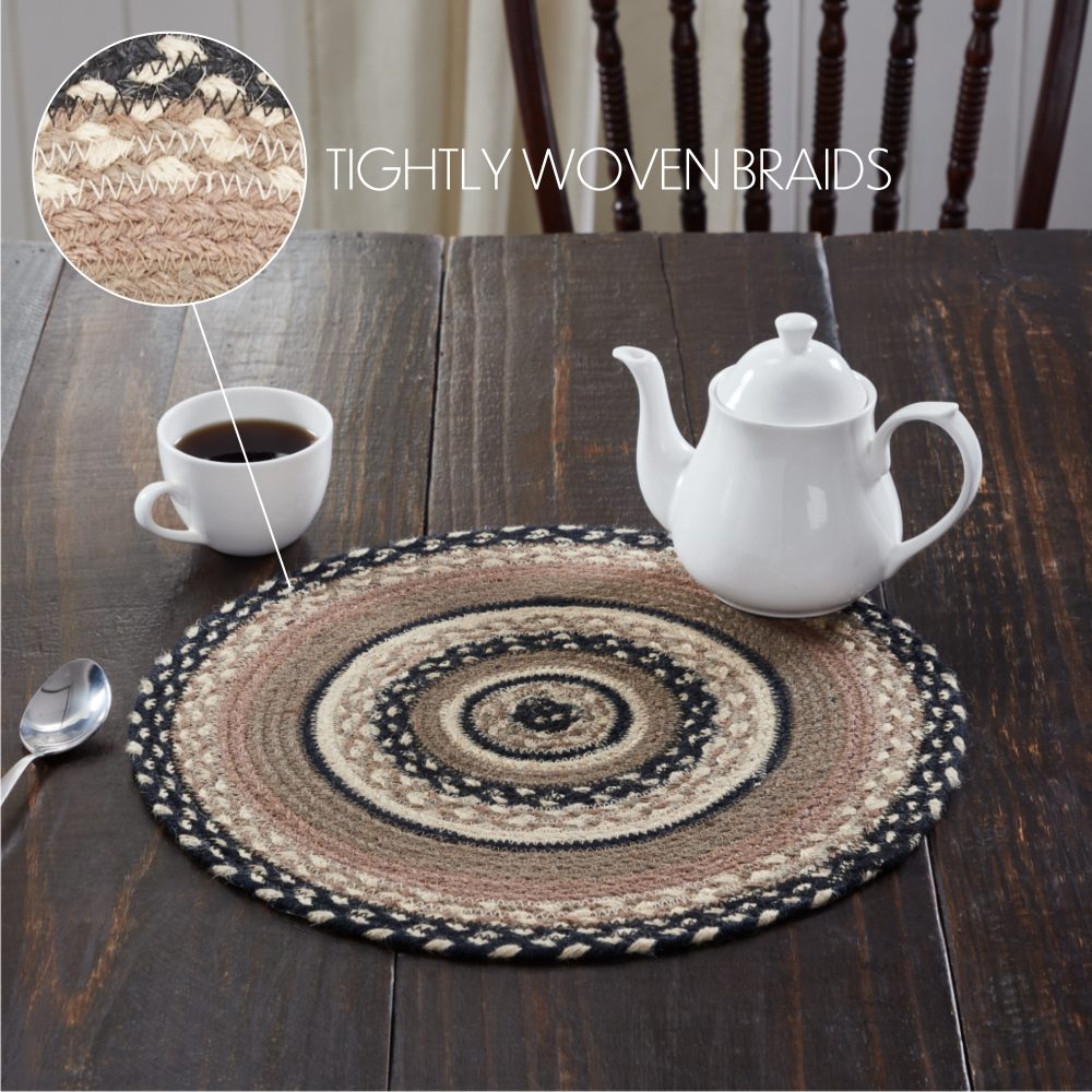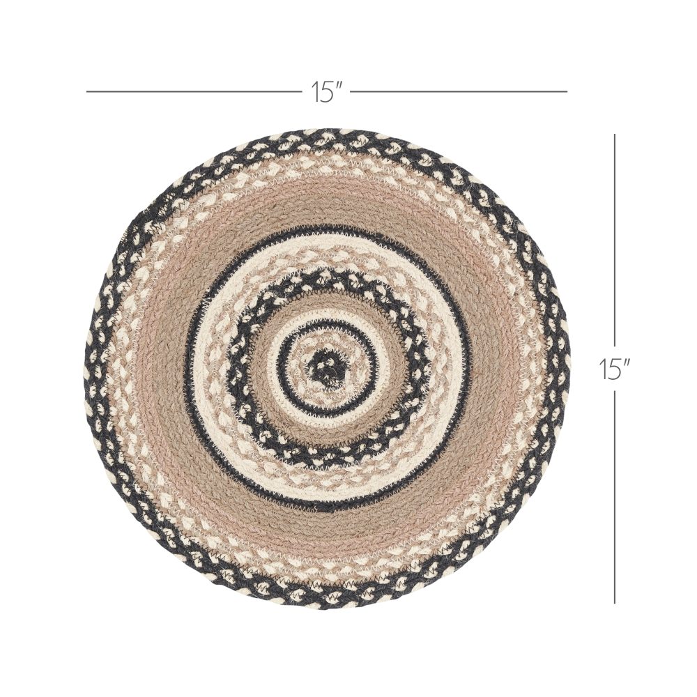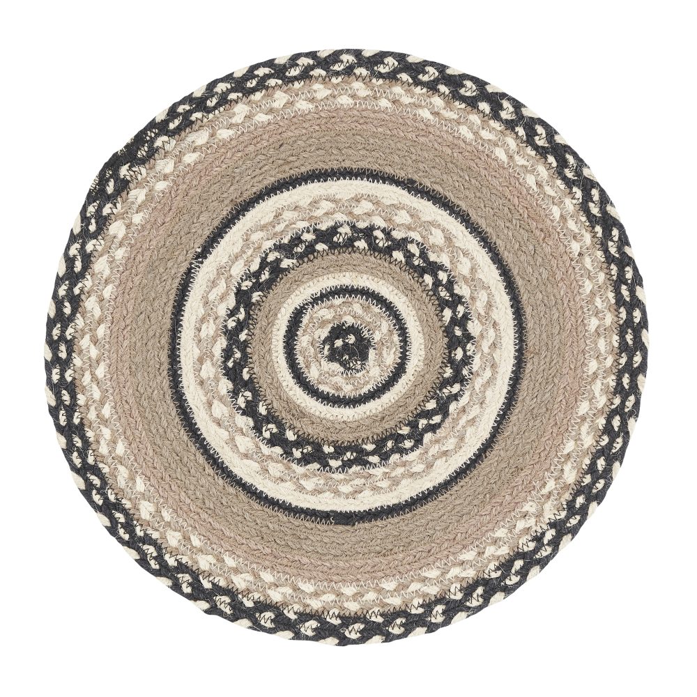 Who says trivets have to be boring? Protect counters and tables from hot pans and dishes with neutral color and classic texture. The Sawyer Mill Charcoal Creme Jute Trivet includes one circular trivet with a 15-inch diameter made from a premium Jute blend. The rich texture of braided jute is given a modern feel with alternating rows of black, grey taupe and white. Complete your tabletop decor with other pieces from the Sawyer Mill Collection by VHC for modern farmhouse style.