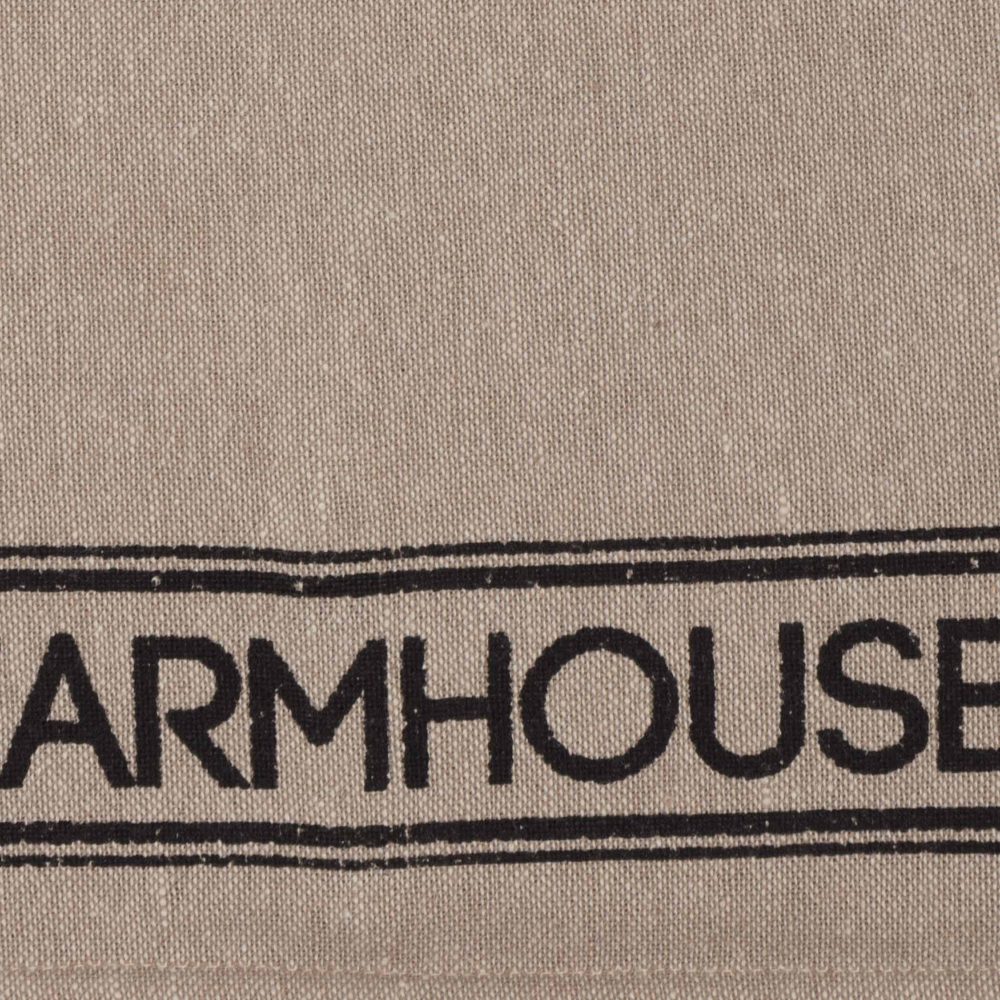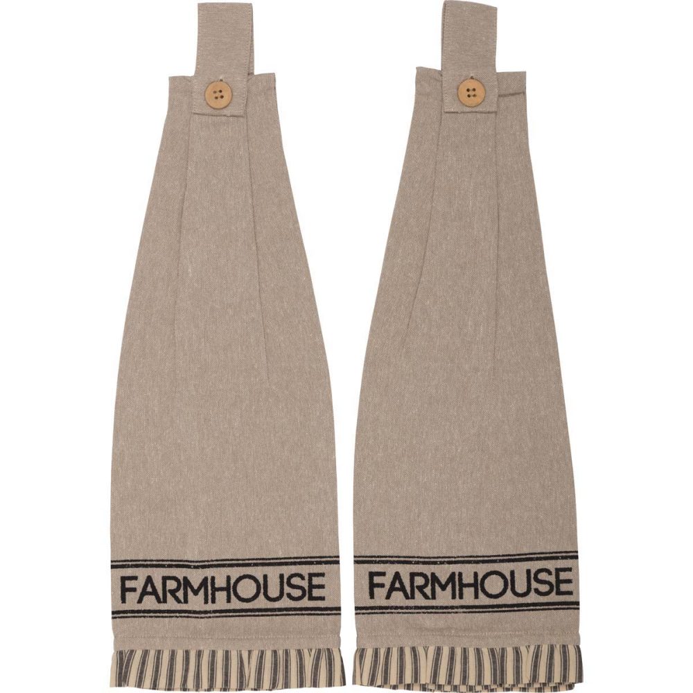 The Sawyer Mill Charcoal Farmhouse Button Loop Kitchen Towel brings a unique farmhouse look to your country kitchen. Featuring the word Farmhouse at the bottom stenciled in distressed black, accented by grain sack stripes above and below it on khaki cotton chambray base. Trimmed with a dark creme and black ticking stripe ruffle at the bottom for a touch of rustic romance and decorative charm. Coordinates with the Sawyer Mill Collection by VHC for a complete vintage farmhouse look for your kitchen and the whole home.