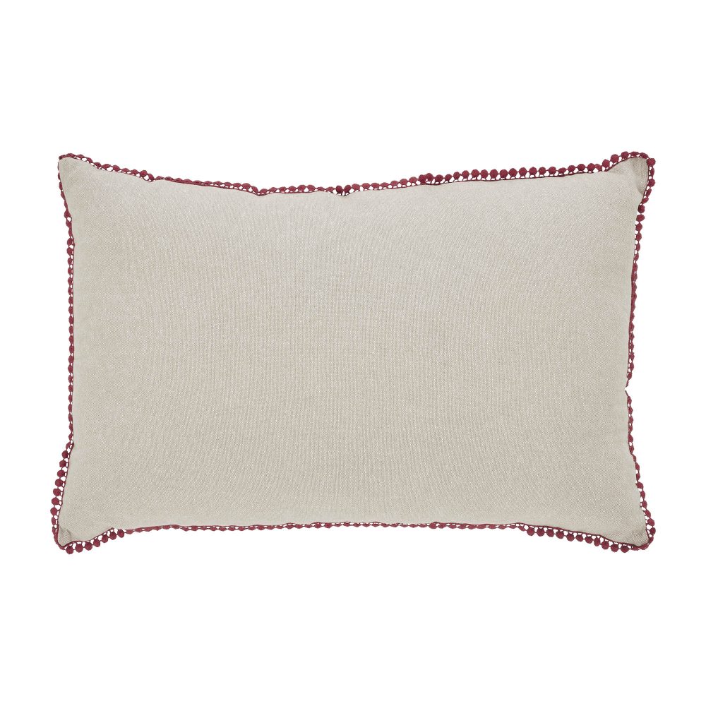 - HOLIDAY EMBROIDERY: A bright red embroidered detail reads, Merry Christmas with a matching mini pom pom border.