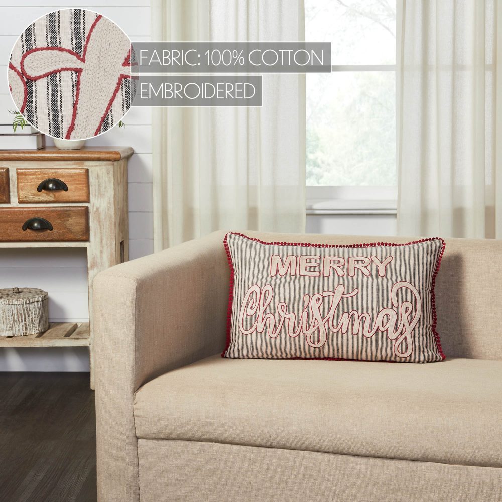 Add vintage farmhouse style with a holiday twist to your home decor with this Christmas accent pillow. The Sawyer Mill Charcoal Merry Christmas Stripe Pillow measures 14 by 22 inches. The filled pillow features a traditional ticking stripe in charcoal grey and tan for a vintage feel. The neutral stripe is accented with cherry red embroidery reading, Merry Christmas. A coordinating red mini pom pom border adds a warm and cheerful element. Spot clean as needed. Coordinates with the Sawyer Mill Collection by VHC for modern farmhouse style for your whole home.