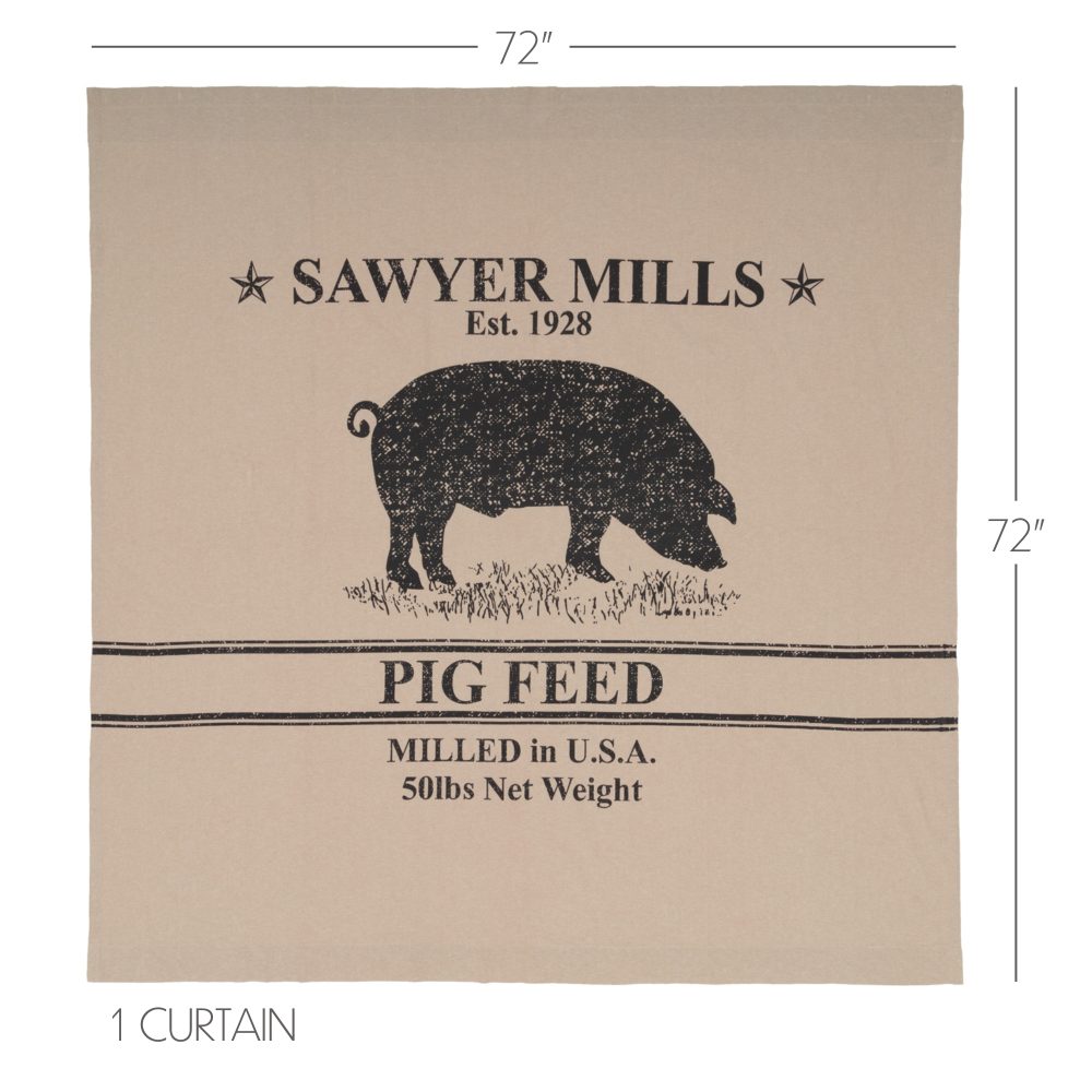 Khaki cotton and distressed black stenciling create a design to capture the essence of modern farmhouse decor. The Sawyer Mill Charcoal Pig Shower Curtain features a khaki chambray with wide black stenciling. Prominently features a stenciled grazing pig over grain-sack-style printing. Measures 72 by 72 inches to fit standard sized showers and baths. Easily hang this classic country bath curtain with shower hooks of your choosing (not included) using the button holes attached. A 3" rod pocket is also available as an alternative hanging method.