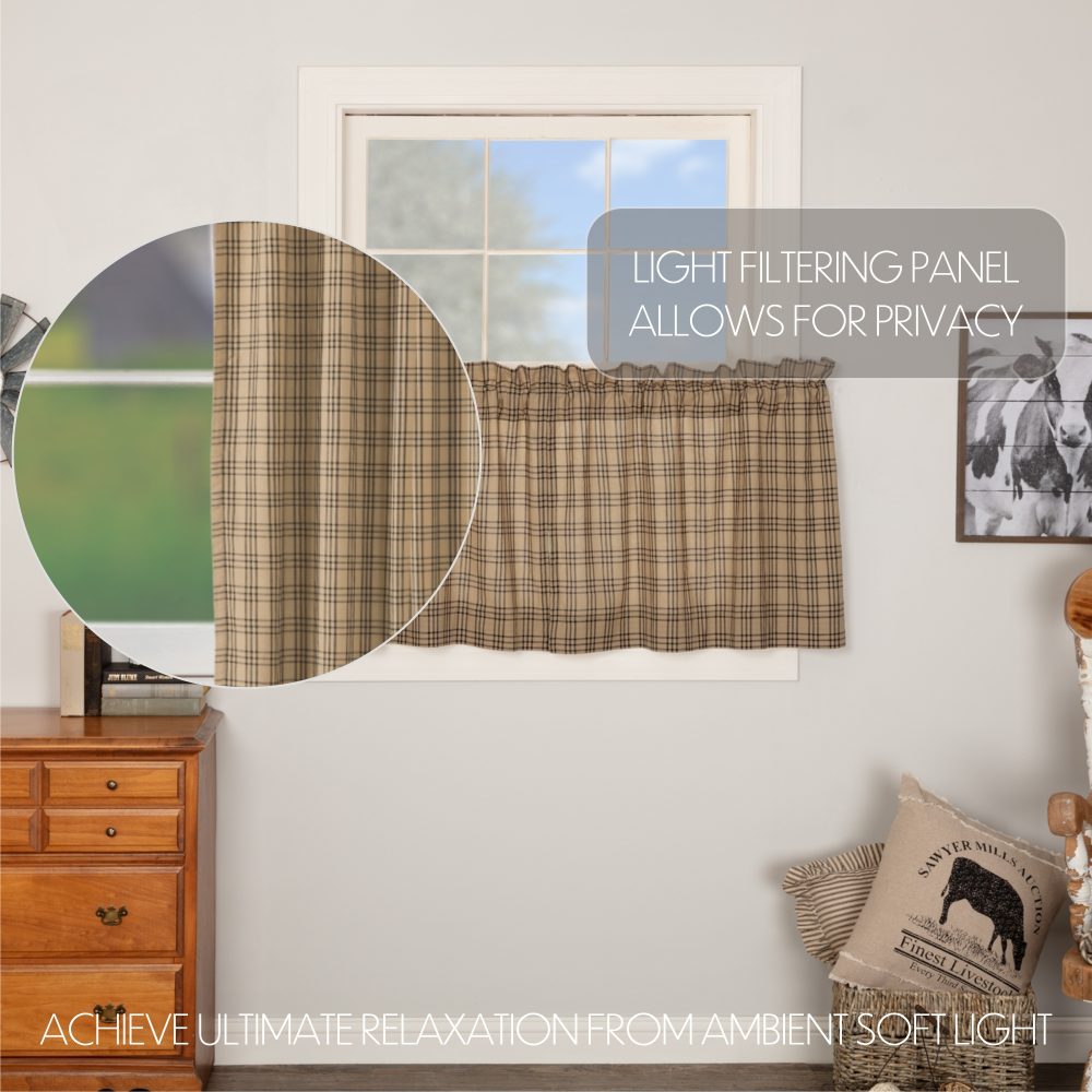 Create the perfectly charming country window of your dreams with these 24x36 inch tier-style curtains. Featuring charcoal black and dark tan plaid, the Sawyer Mill Charcoal Plaid Tier Set provides just the right balance of privacy and sunshine. Pair with a matching valance or prairie swag for a fully decorated look or alone for a simple pop of color and character. Also known as cafe or bistro curtains, these are a particularly good fit for decorating farmhouse kitchens, laundry rooms, and small bathroom windows.