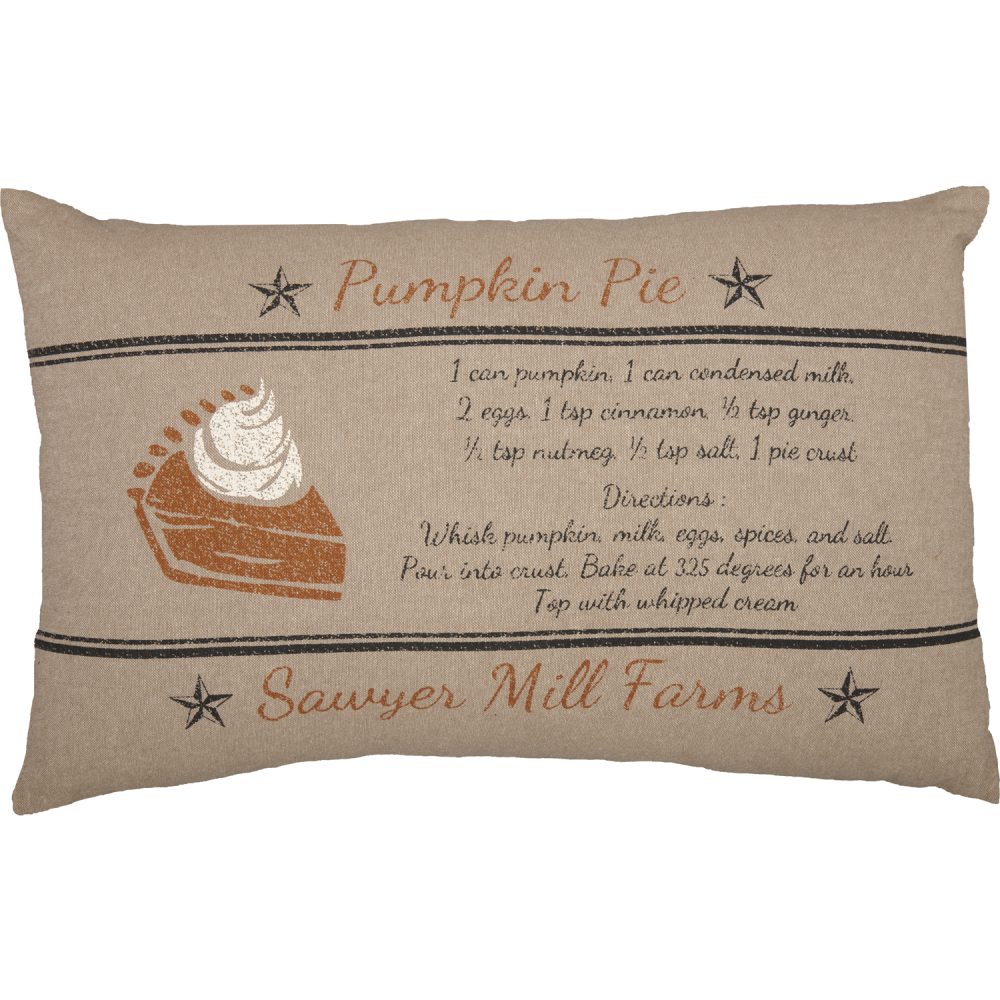 - FARMHOUSE ARTISTRY & QUALITY: Introduce rustic charm with this 14×22 inch VHC Brands Sawyer Mill throw pillow, expertly crafted from durable woven cotton chambray, showcasing a unique pumpkin pie image complete with an easy-to-follow recipe on one side, elegantly detailed with authentic distressed grain sack stripes and quaint country stars, while offering a reversible design to a simple chambray fabric secured by classic button closures for versatile styling and seamless coordination with VHC Brands’ Fall Farmhouse Collections.