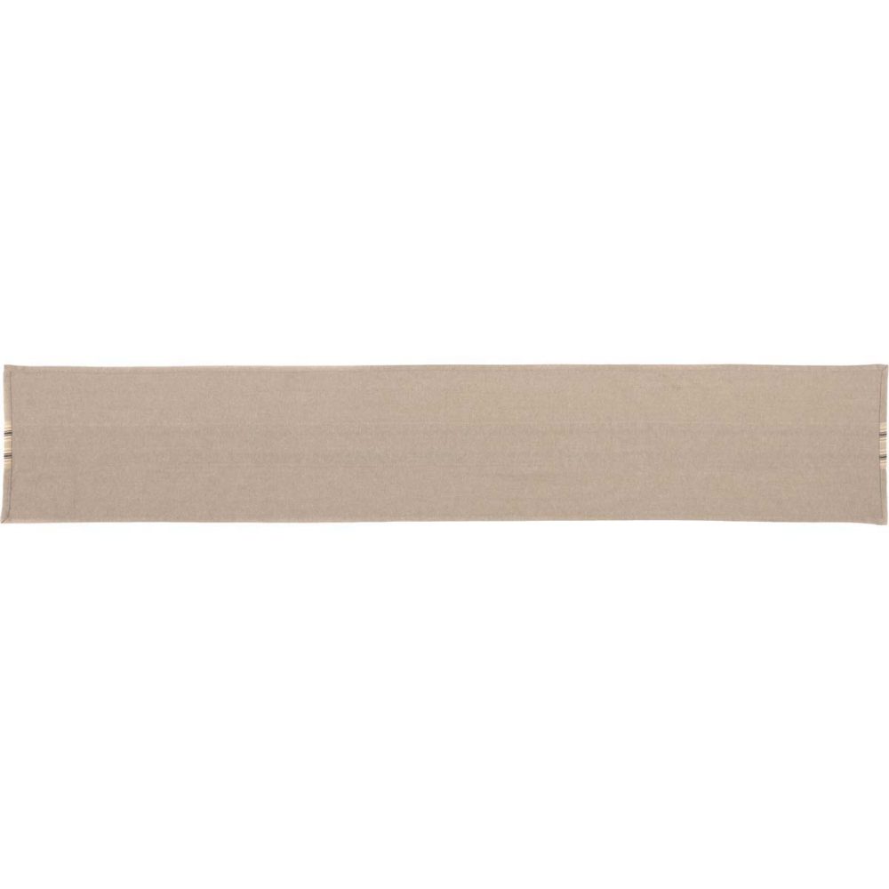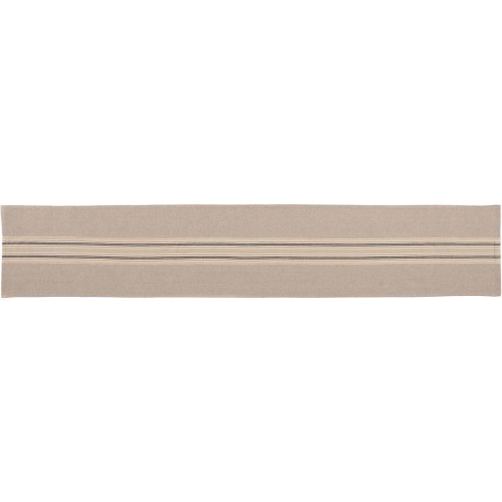 Create a joyful table for friends and family to gather round with a charming modern farmhouse design. The Sawyer Mill Charcoal Stripe Runner includes one table runner measuring 13x72 inches. The rich texture and straight edging of the cotton chambray fabric is given a vintage feel with a muted khaki tan color. A charcoal grey and dark creme grain sack stripe is appliqued horizontally across the center of each mat for a unique farmhouse look. Complete your tabletop decor with other pieces from the Sawyer Mill Collection by VHC for modern farmhouse style.