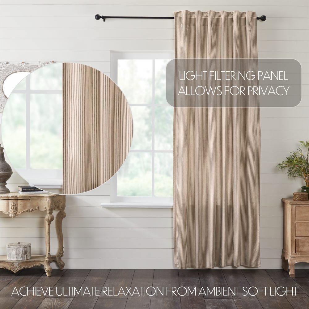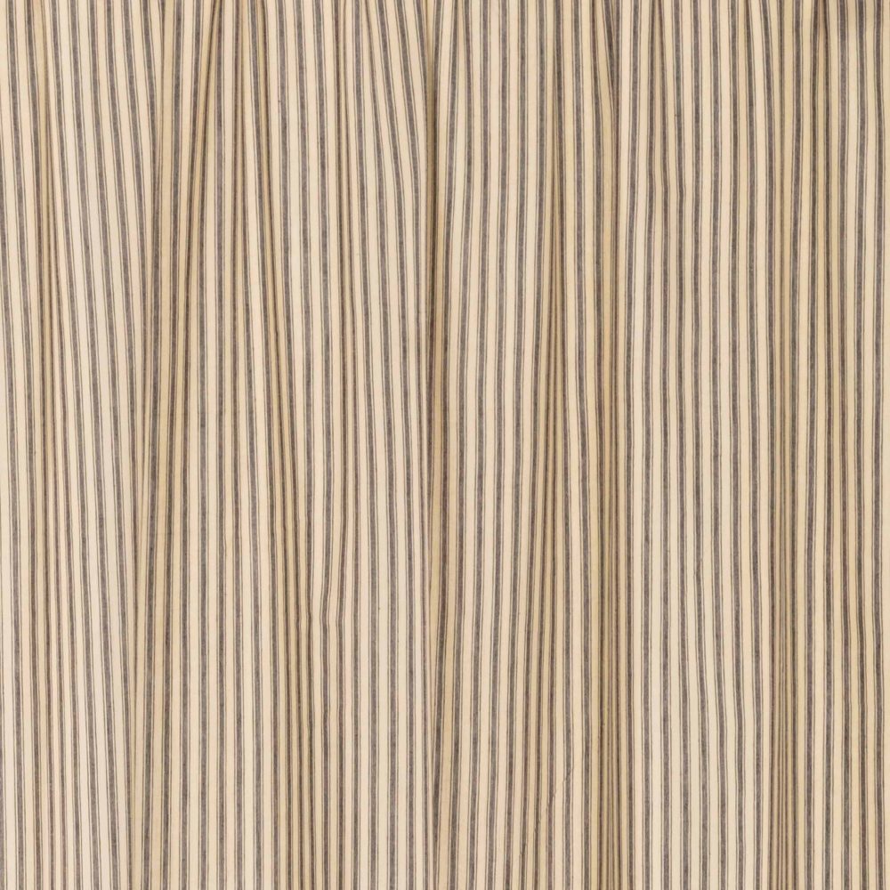 Create a warm, vintage farmhouse look for your home. The Sawyer Mill Charcoal Ticking Stripe Panel 96x50 features beautiful charcoal black striping over a dark creme base to create a classic farmhouse ticking stripe pattern. Includes a soft, white cotton lining to filter sunlight and prevent fading. A rod pocket and loops offer easy hanging options.